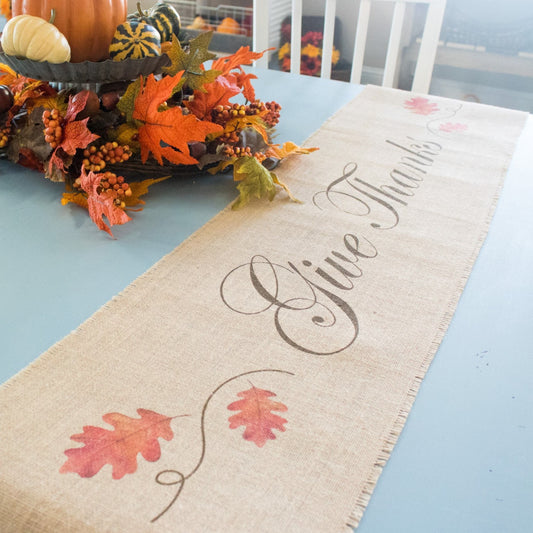 Give Thanks Thanksgiving Burlap Table Runner w/ Oak Leaves