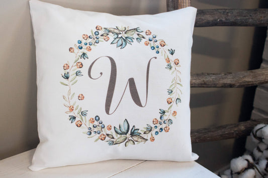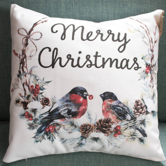 Merry Christmas Wreath throw pillow - Holiday bullfinch bird and feather rustic farmhouse style gift