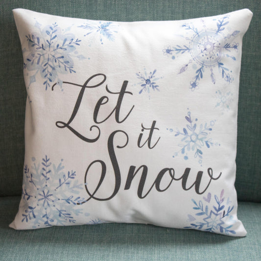 Let it Snow winter decor throw pillow with blue watercolor snowflakes