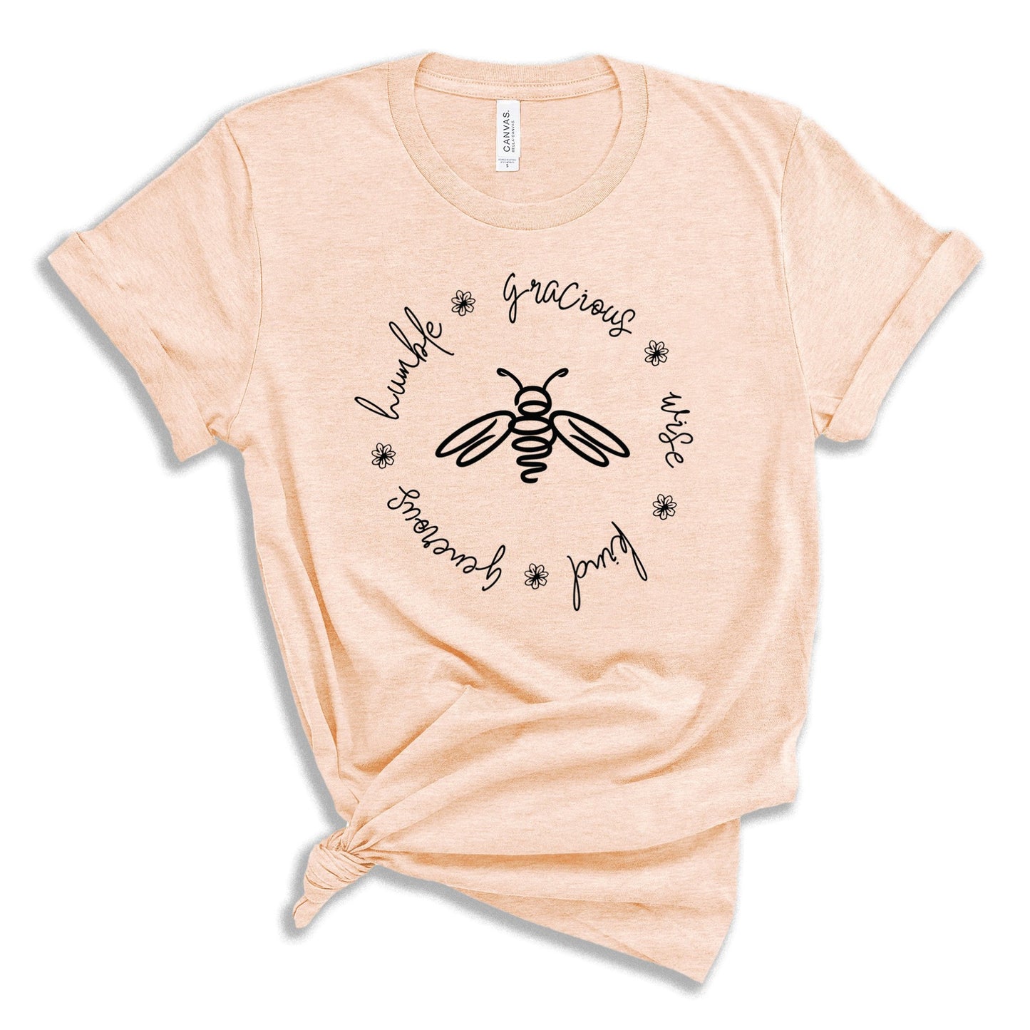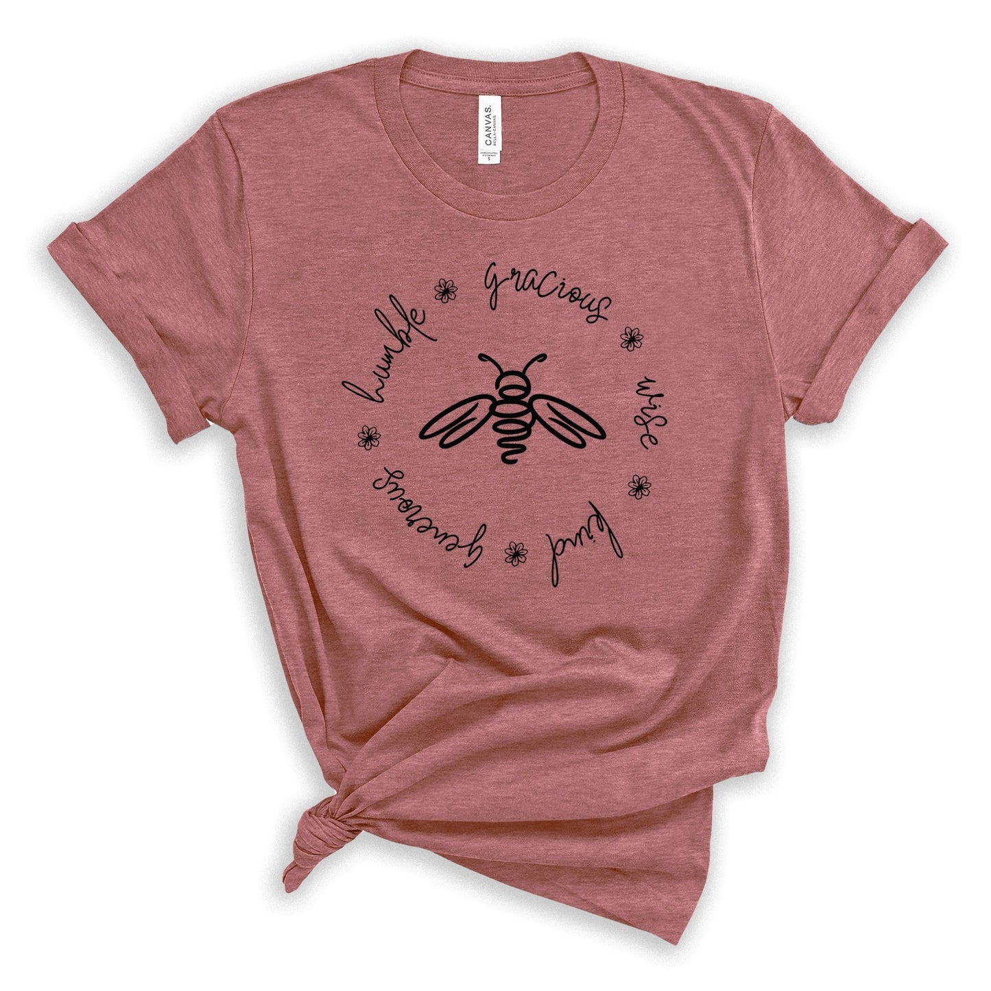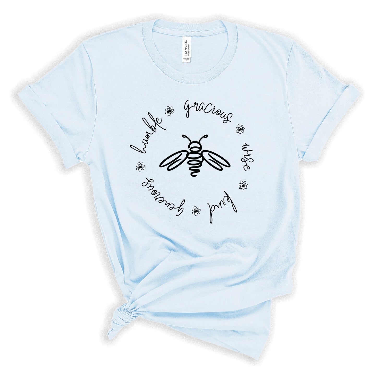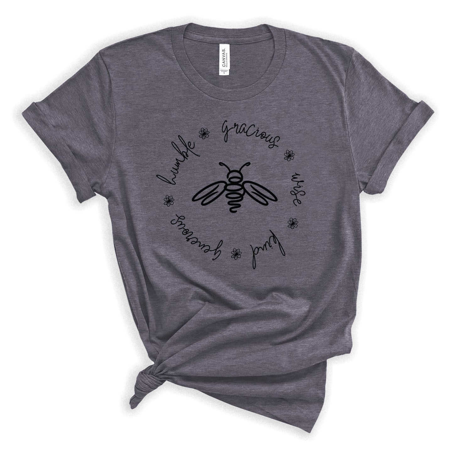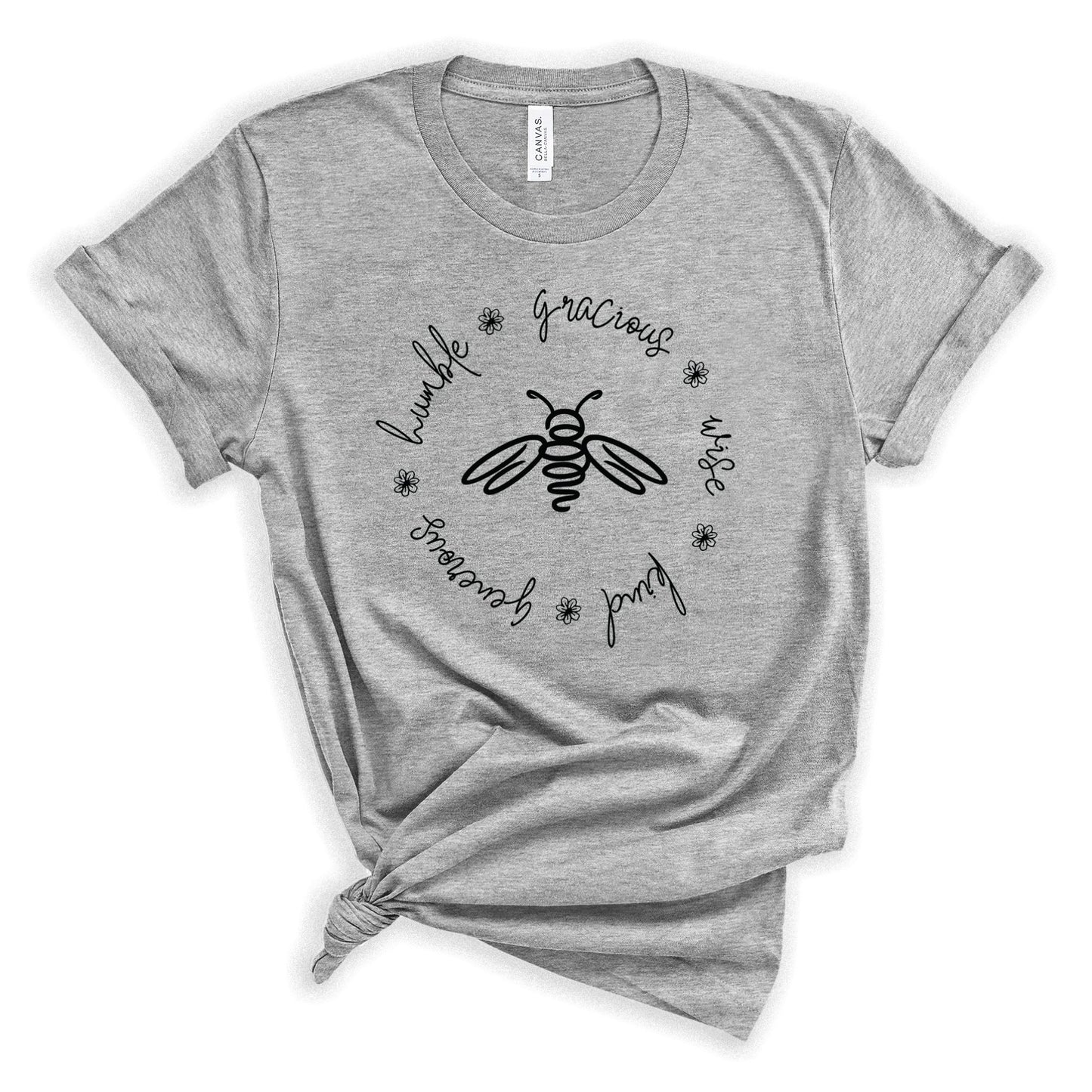 Bees are the tiny little creatures that ironically hold our planet's eco-system together. Kindness, wisdom, humility, graciousness are the tiny little things that hold our society together. This minimalist bee is surrounded by the words humble, gracious, wise, kind, generous. This t-shirt is printed on a crazy soft, unisex bella canvas tee that is easy to love.