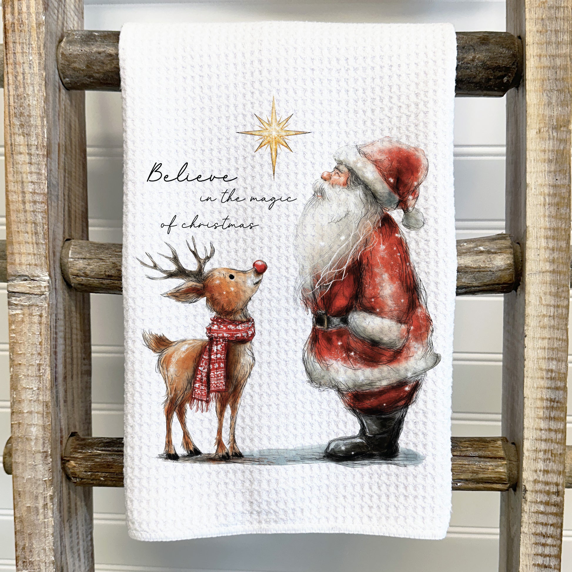 Bring home the wonder of the season with this charming Santa and Rudolph tea towel. With soft watercolor details and a hand-drawn look, this design captures that sweet, nostalgic Christmas magic we all love.