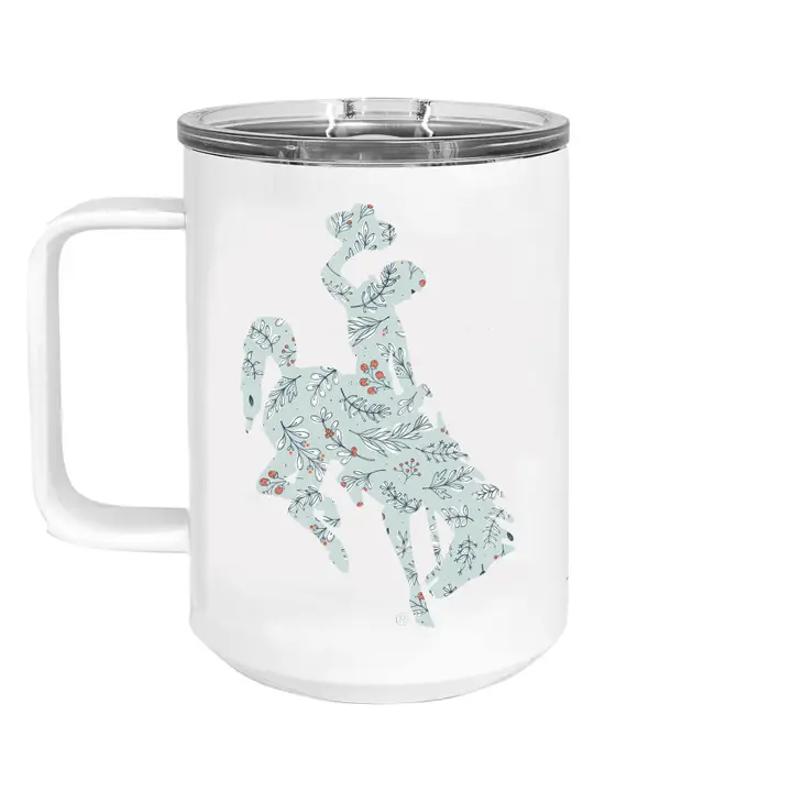 Carry a touch of Western charm with this Blue Pipberry travel mug. Featuring the officially licensed Wyoming bucking horse and rider accented by a delicate pipberry design, it’s a perfect mix of rustic and refined. The stainless steel mug keeps your drinks hot or cold while fitting easily in your car cup holder. Printed in our Wyoming studio.