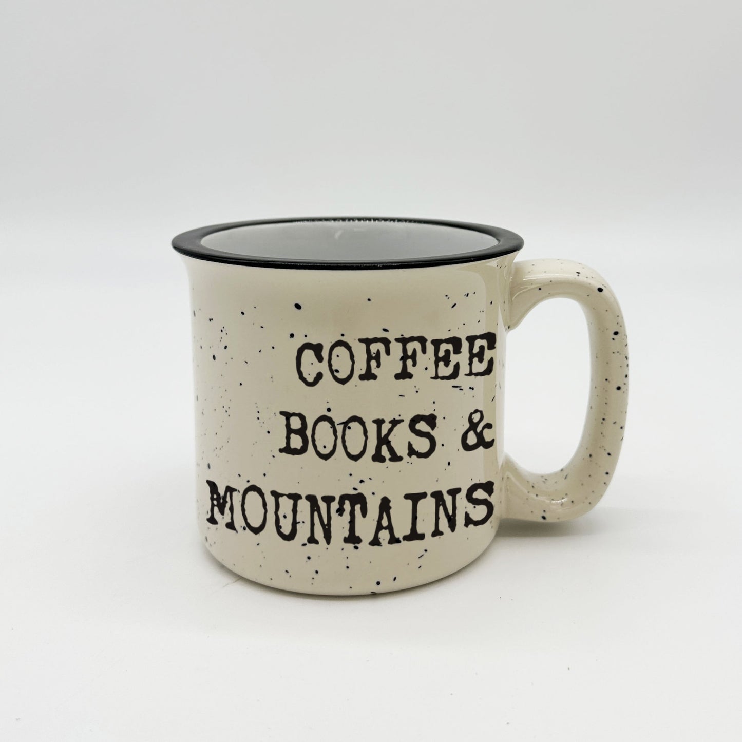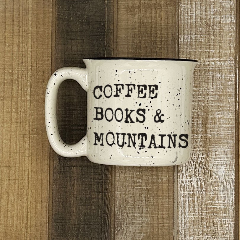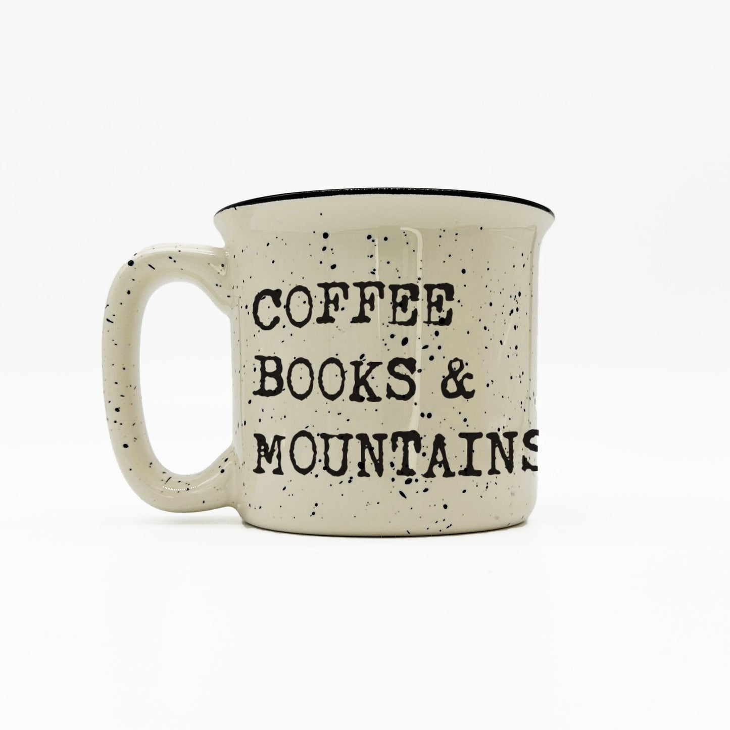 With its cream-colored base adorned with striking black flecks, each mug is uniquely speckled, adding a touch of rustic elegance to your coffee ritual. But what truly sets this mug apart is the inspiring mantra emblazoned across its surface: "Coffee Books & Mountains."