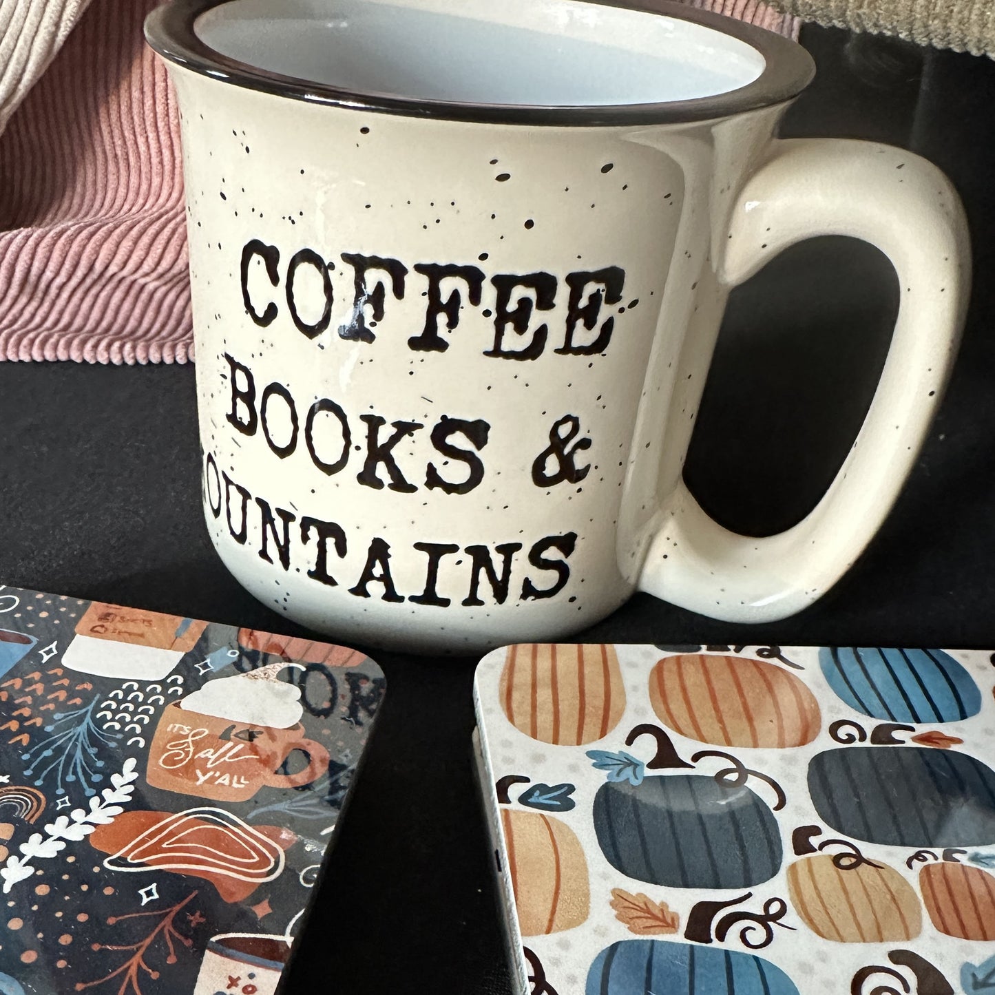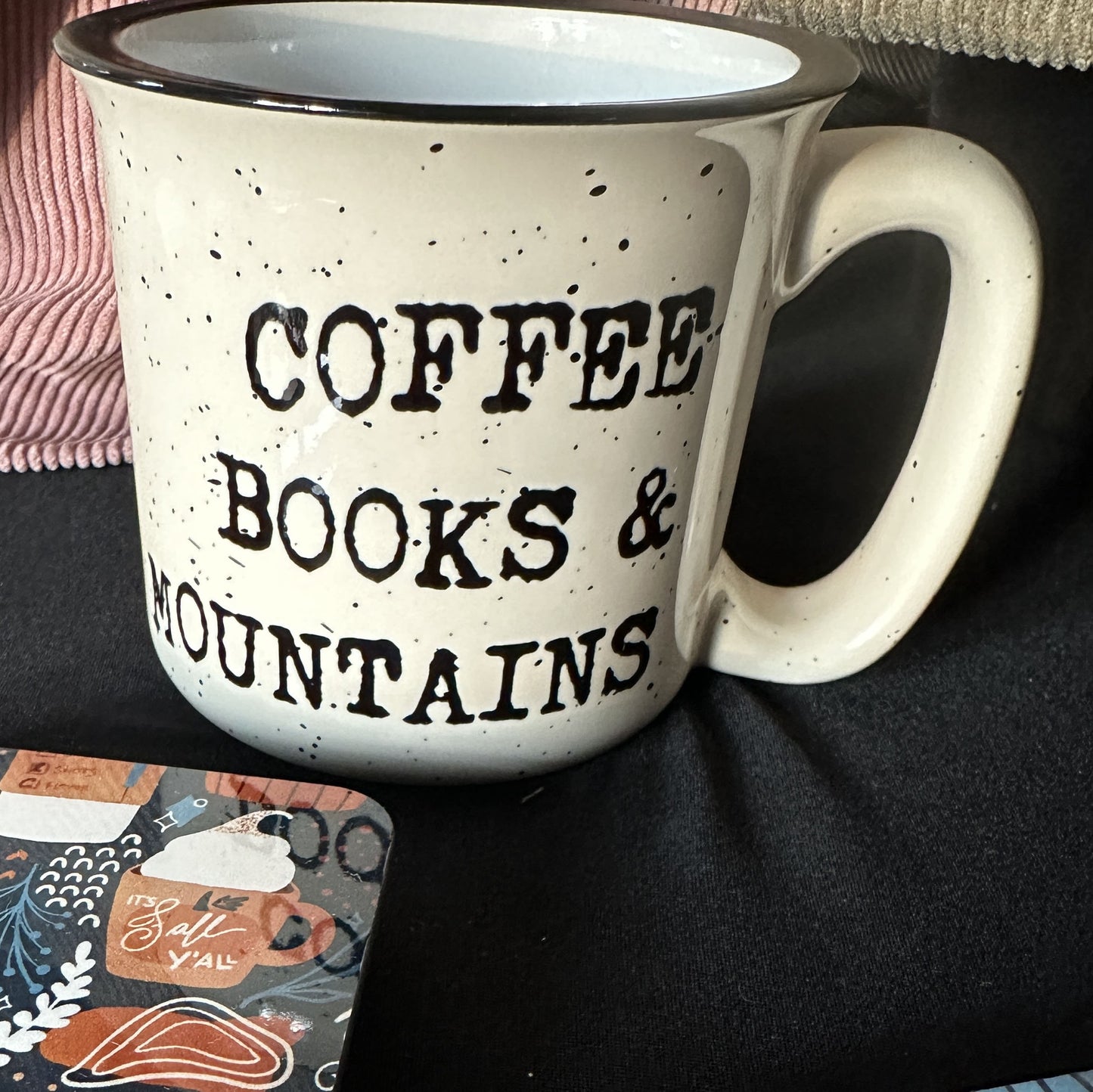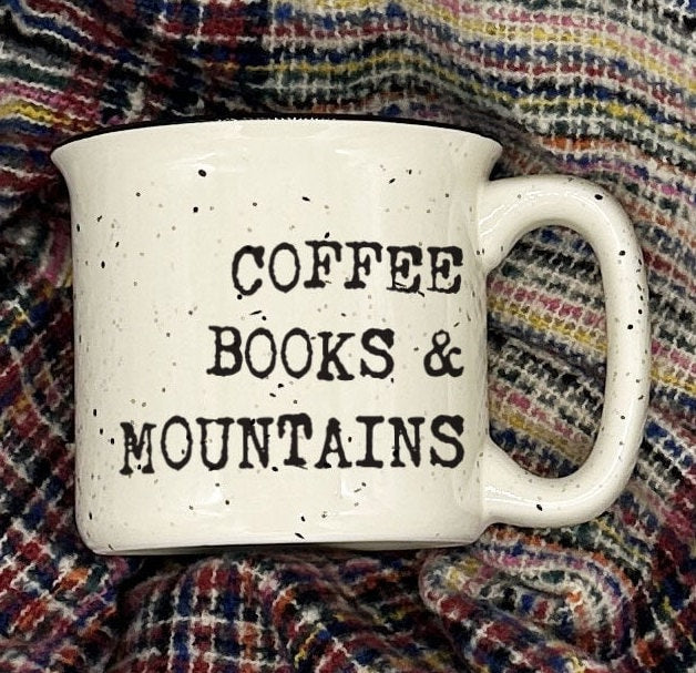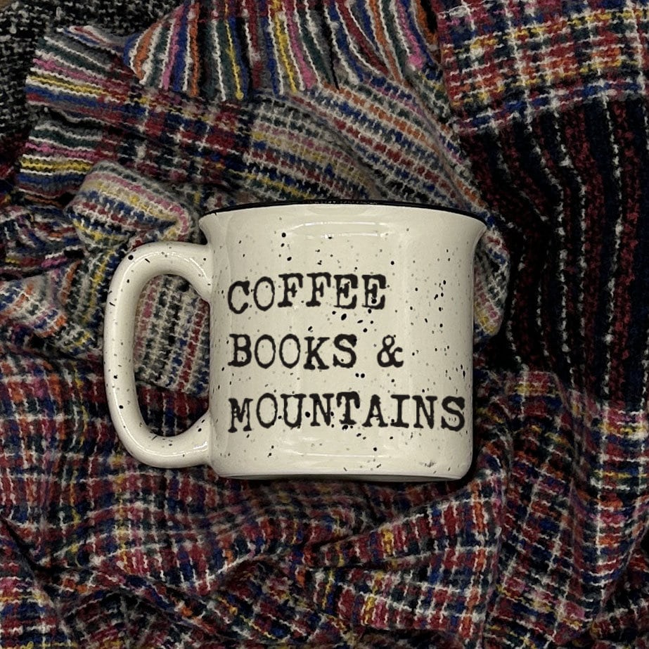 With its cream-colored base adorned with striking black flecks, each mug is uniquely speckled, adding a touch of rustic elegance to your coffee ritual. But what truly sets this mug apart is the inspiring mantra emblazoned across its surface: "Coffee Books & Mountains."