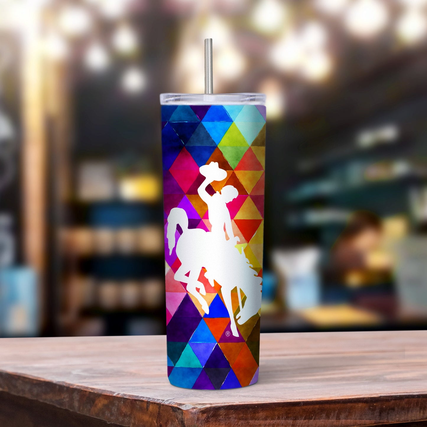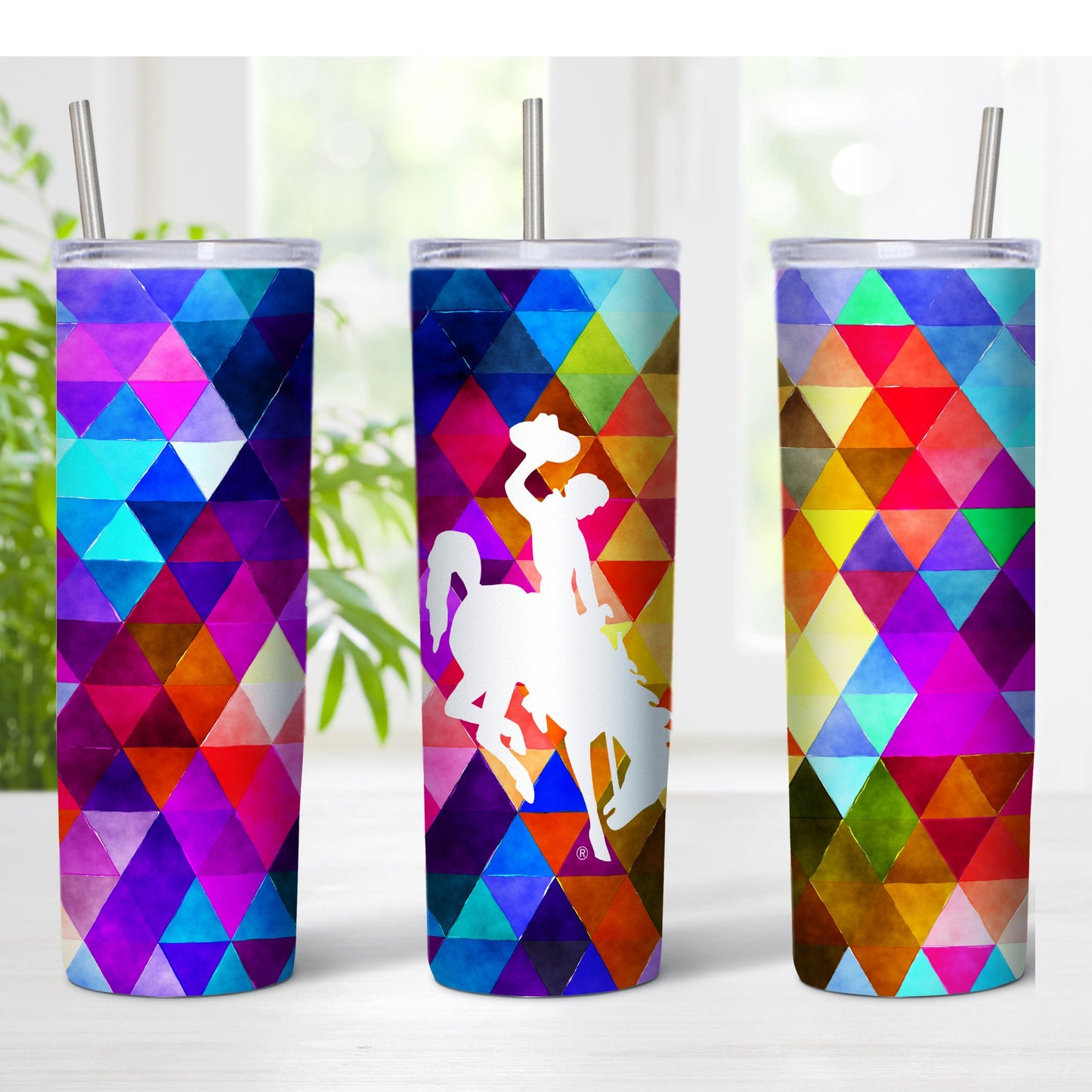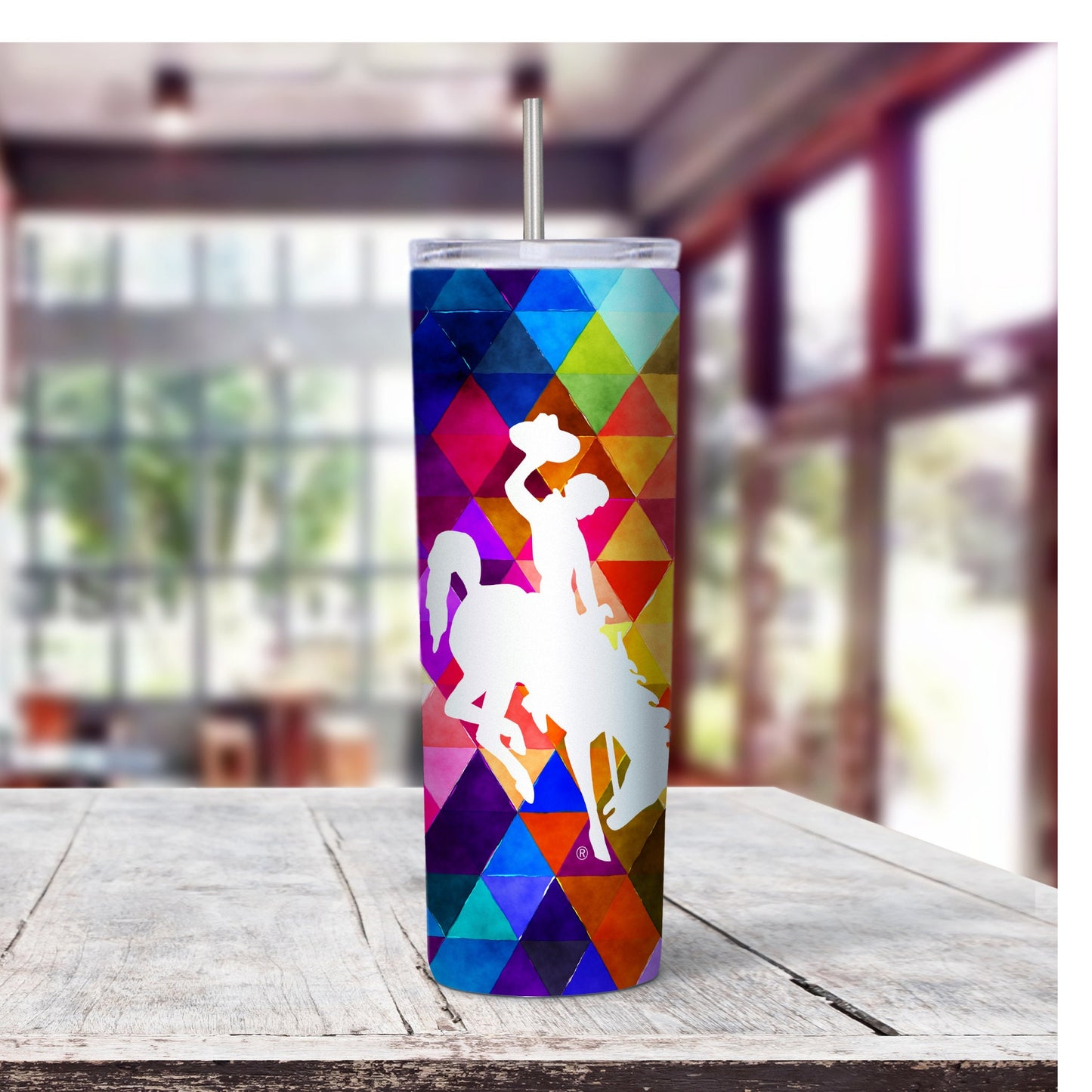 This beautifully bright pattern with a white bucking horse is perfect for any tumbler or cup collector! It is a perfect colorful addition! Skinny tumblers are all the rage! This 20 oz insulated tumbler features double-wall, vacuum insulation which means they are 2x heat and cold resistant compared to glass or plastic. Includes a clear lid and a stainless straw.
