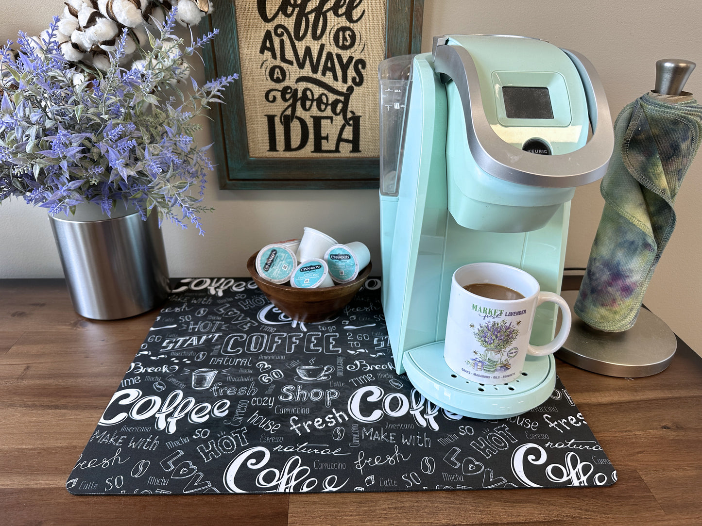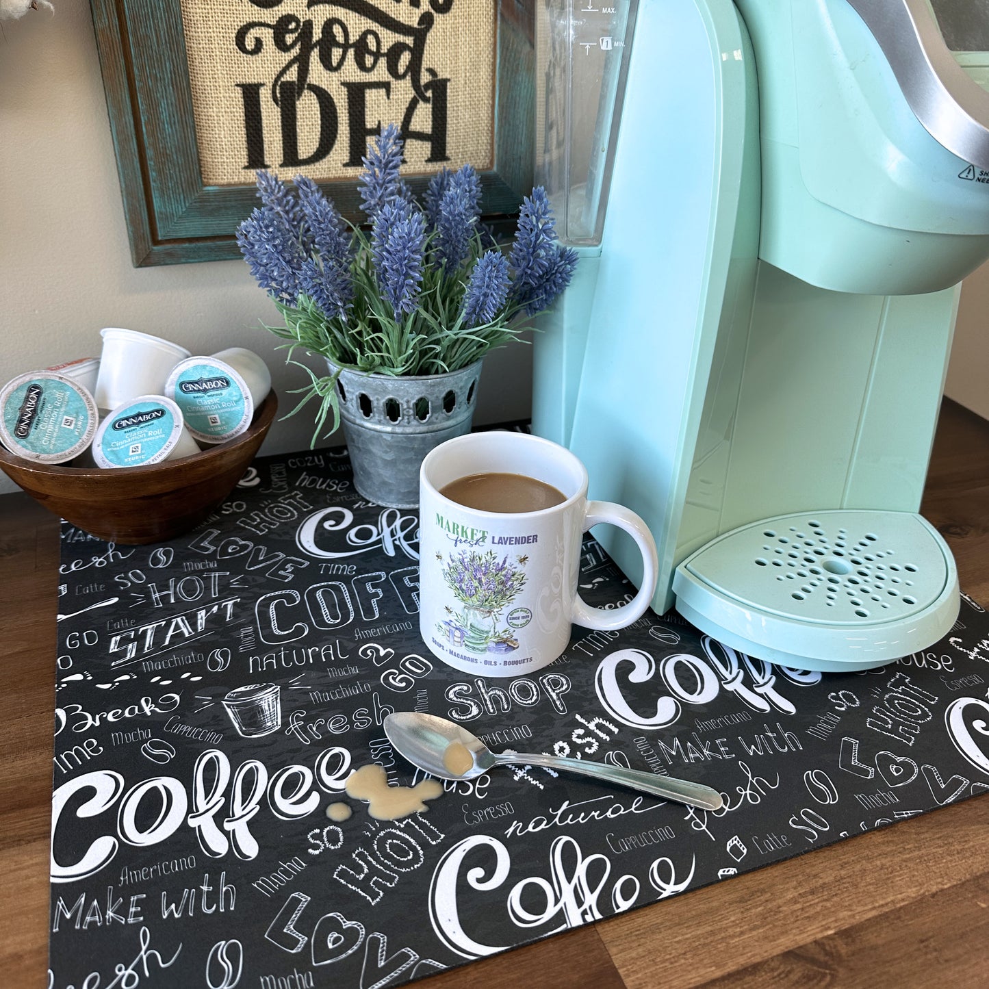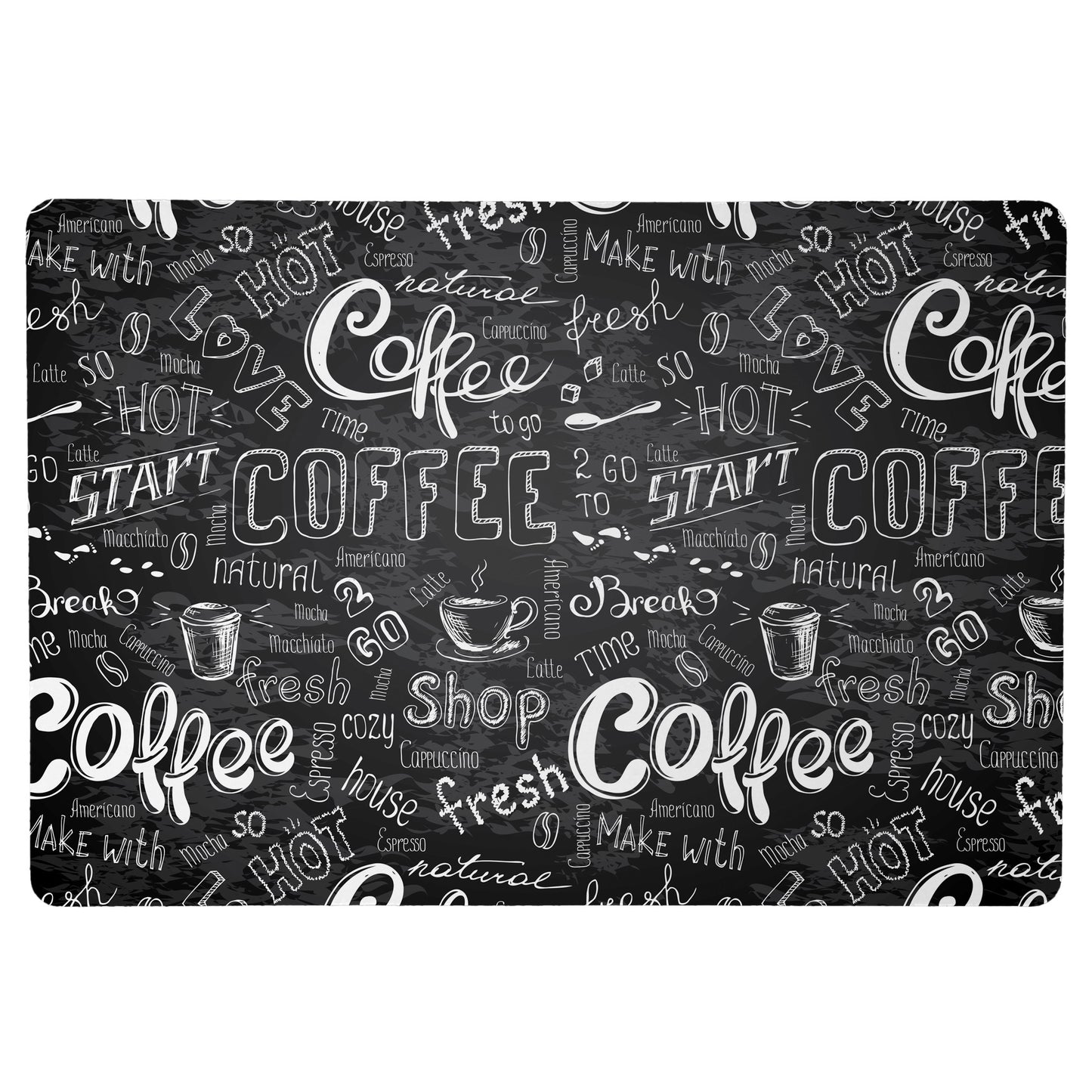 Elevate your coffee routine with this charming Coffee Maker Mat featuring a playful chalkboard design. Not only does this mat provide a designated space for your caffeine rituals, but it also adds a touch of decor to your kitchen. The padded surface protects your countertops while making cleaning a breeze. Available in two sizes, it's the perfect find for any coffee lover or a thoughtful gift for the person who has it all.