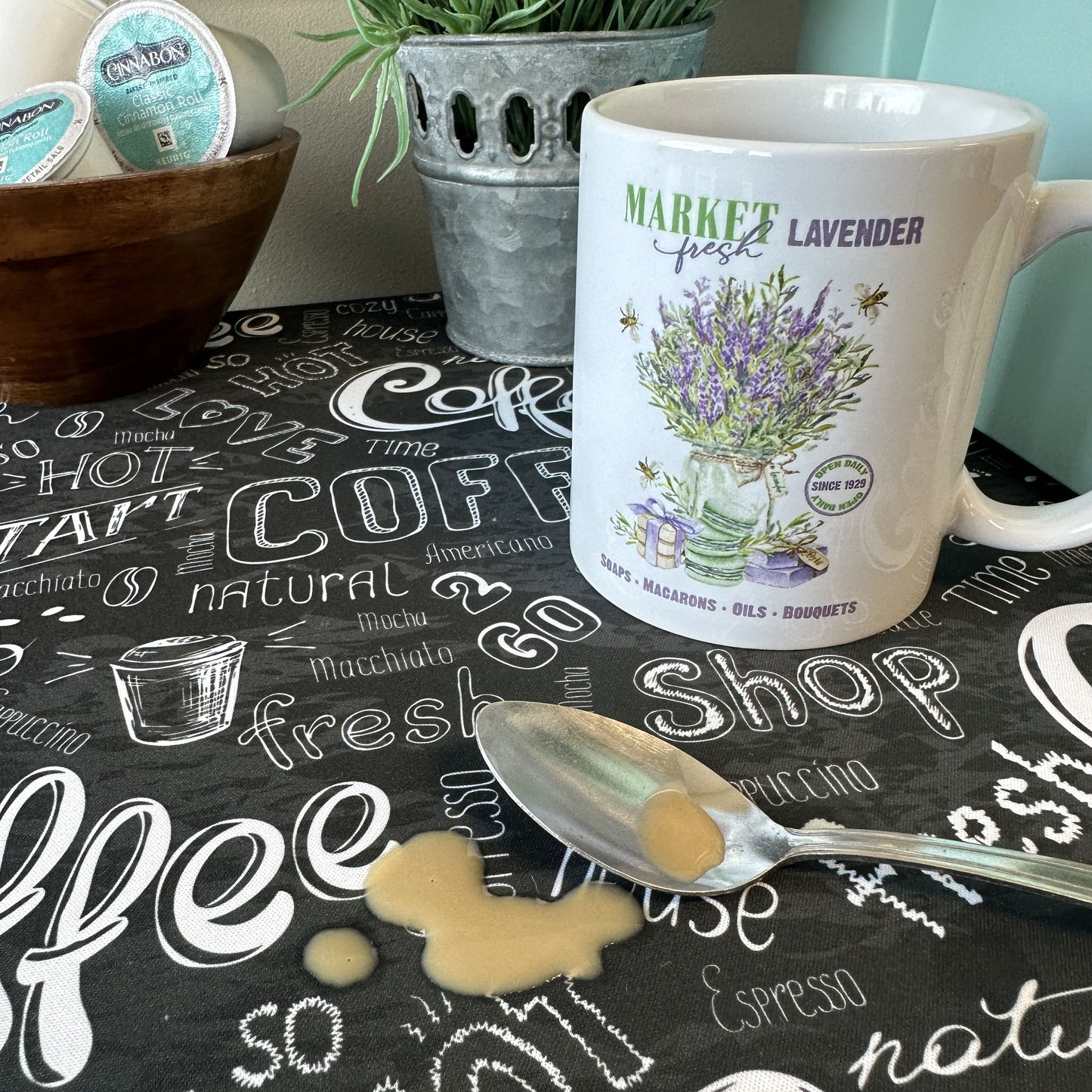 • Vibrant, colorful coffee bean print adds style to any coffee station