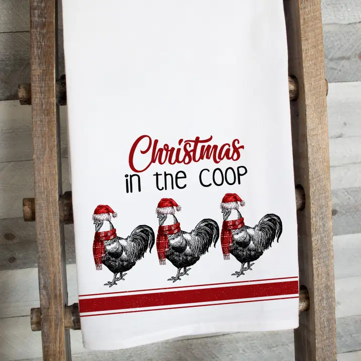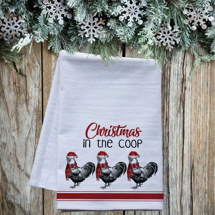 Bring farmhouse charm to your kitchen this holiday season with our "Christmas in the Coop" Flour Sack Tea Towel. Featuring a festive design with cheerful chickens and holiday accents, this towel adds a cozy, rustic touch to your kitchen décor.