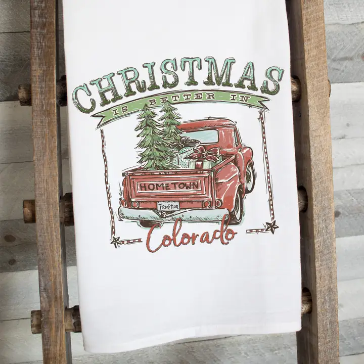 Celebrate the magic of the holiday season with our "Christmas is Better in Colorado" Flour Sack Tea Towel in Teal. Featuring a charming retro truck design, this tea towel brings a unique and festive touch to your kitchen, celebrating the joy of Christmas in the beautiful state of Colorado. Made from 100% premium flour sack cotton, it’s soft, absorbent, and perfect for drying dishes or adding a pop of holiday decor to your home.