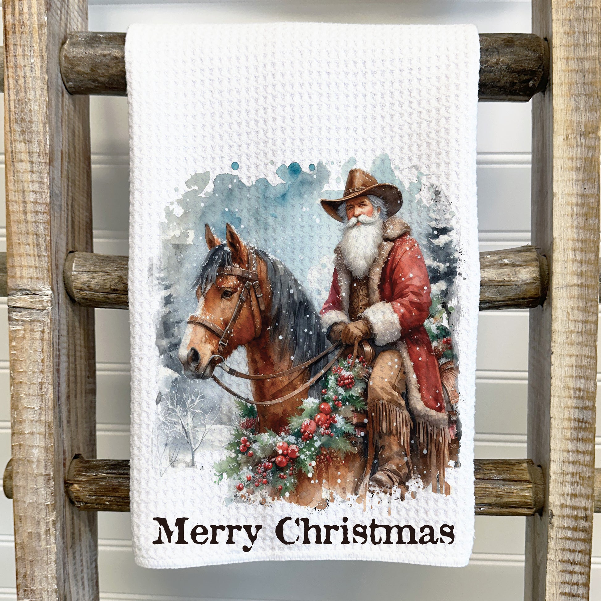 Bring the spirit of a Western Christmas into your home with our Cowboy Santa Merry Christmas Tea Towel. Featuring a beautifully detailed watercolor-style Santa riding his horse through the snow—complete with a festive wreath and classic red coat—this towel is the perfect blend of rustic charm and holiday warmth.