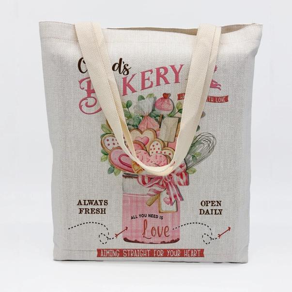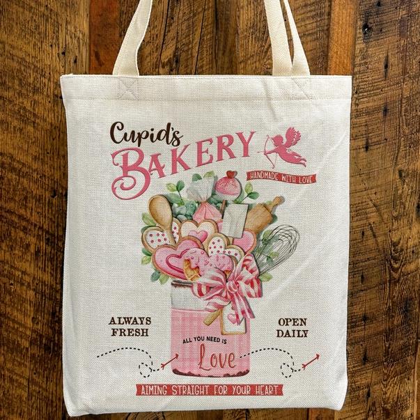 Bring the holiday cheer everywhere you go with this festive Cupid's Bakery tote bag! Perfect for everyday use or as a special holiday gift, this durable canvas tote is designed to carry everything you need from books to baked treats, and more.