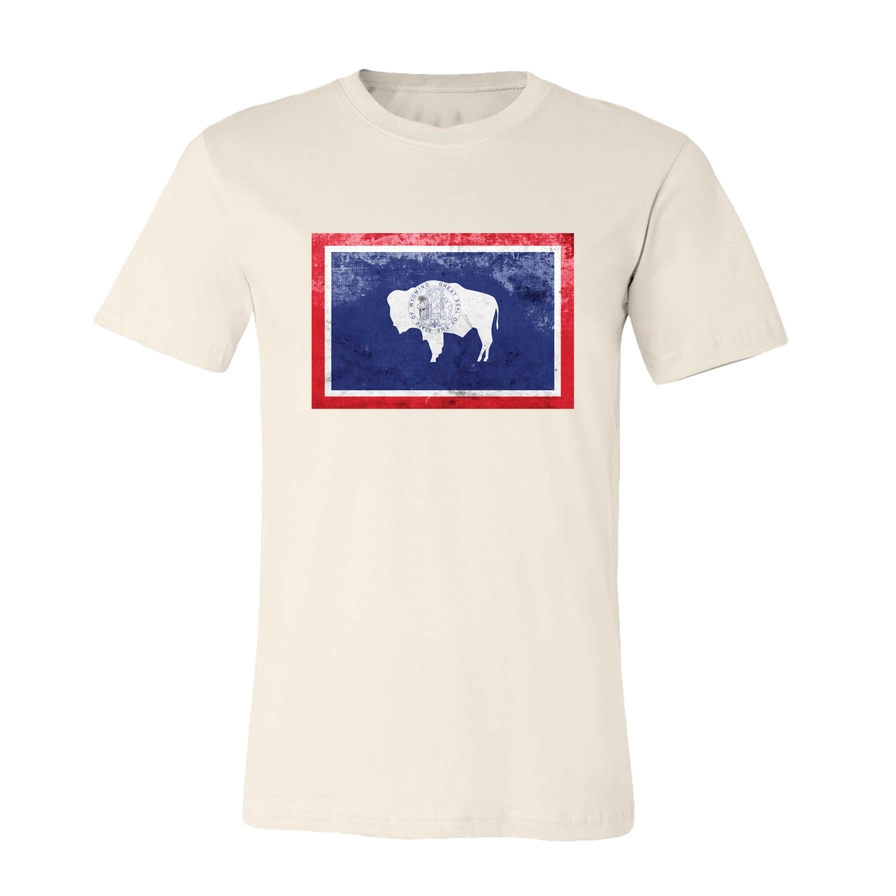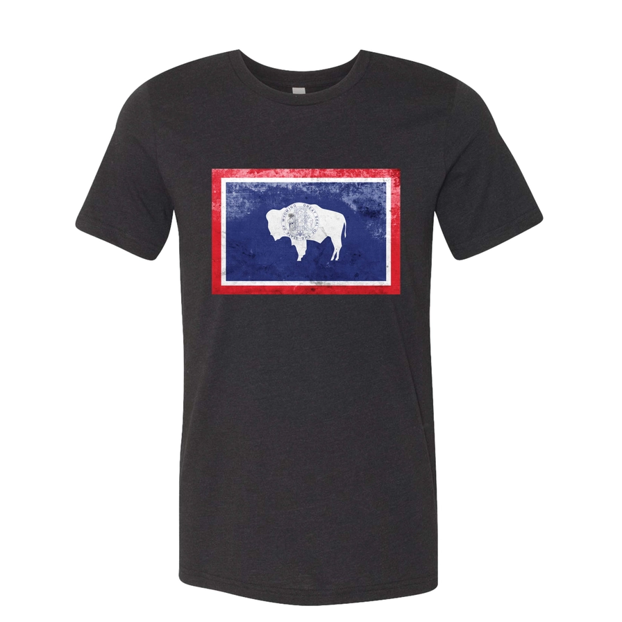 - Distressed Wyoming Flag Graphic: Features a vintage, worn-in Wyoming flag design that adds a rustic, classic touch to any look.