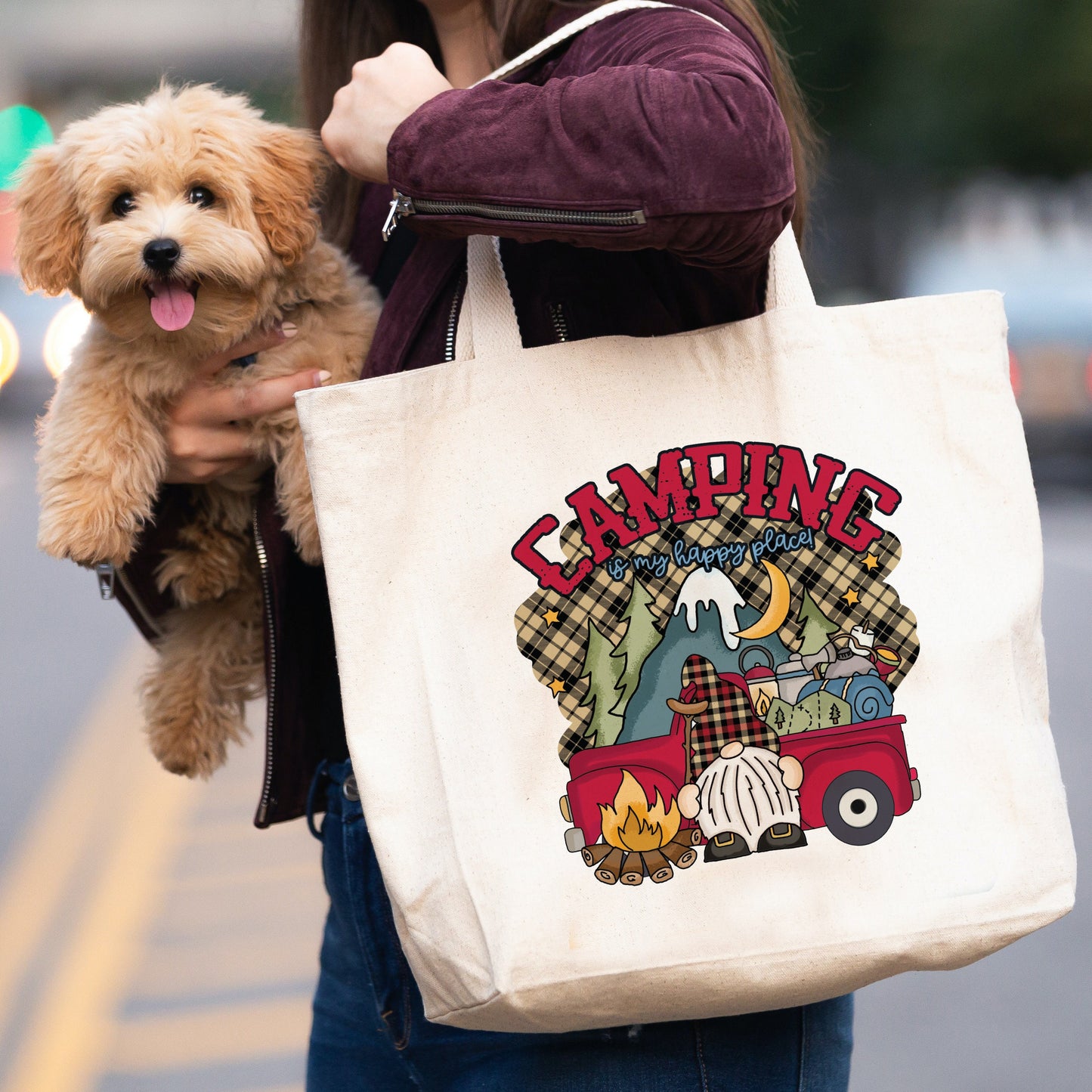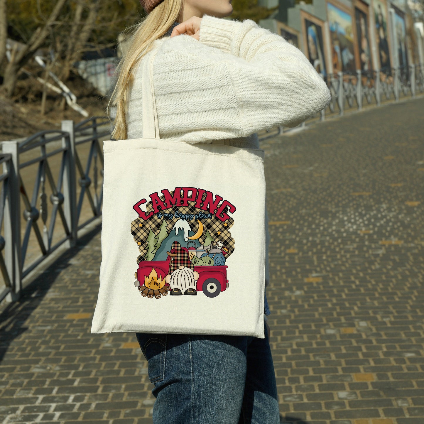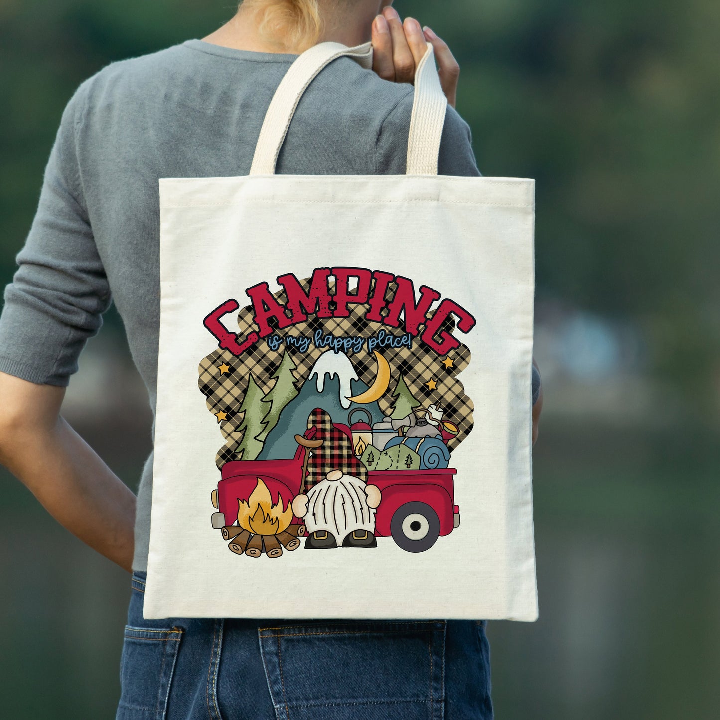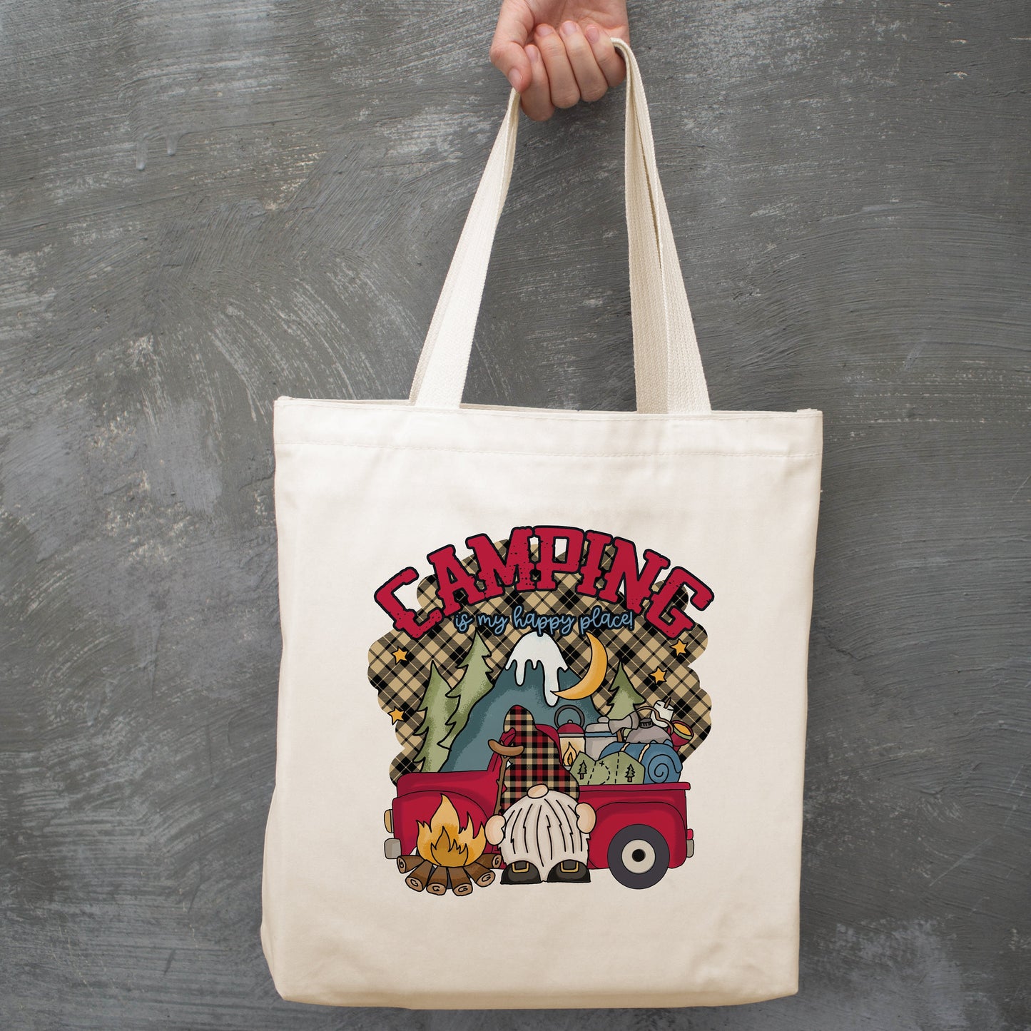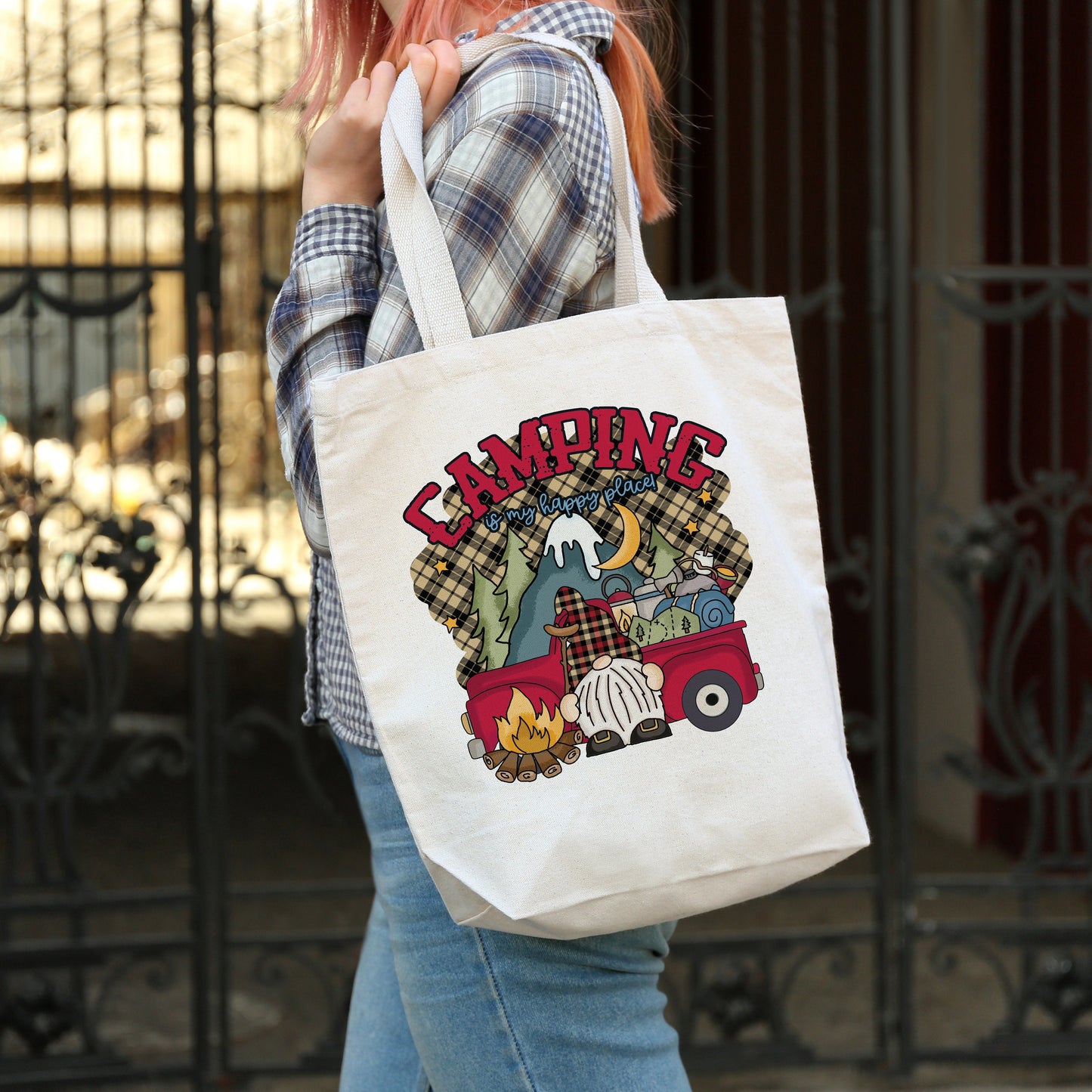 Add a touch of whimsy to your everyday routine with our Happy Place Camping Gnome canvas tote bag! This premium carryall is the perfect companion for all your adventures, whether it's carting around books, hitting up the store for some retail therapy, or stocking up on groceries without harming the environment. It's a must-have for anyone who loves a good old-fashioned gnome-tastic time!