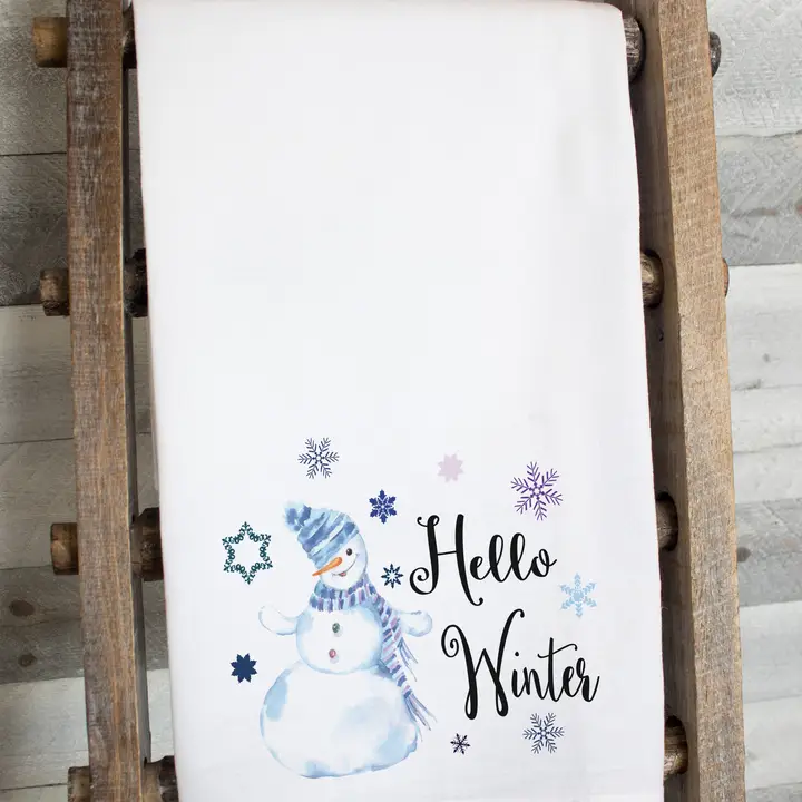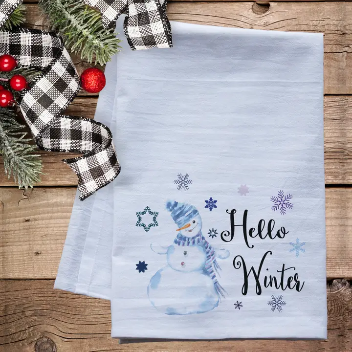 Welcome the winter season with our "Hello Winter" Snowman Flour Sack Tea Towel. Featuring an adorable snowman design, this tea towel brings warmth and festive charm to your kitchen or dining space. Made from 100% premium flour sack cotton, it’s soft, absorbent, and perfect for drying dishes, wiping up spills, or adding a decorative touch to your home during the holiday season.