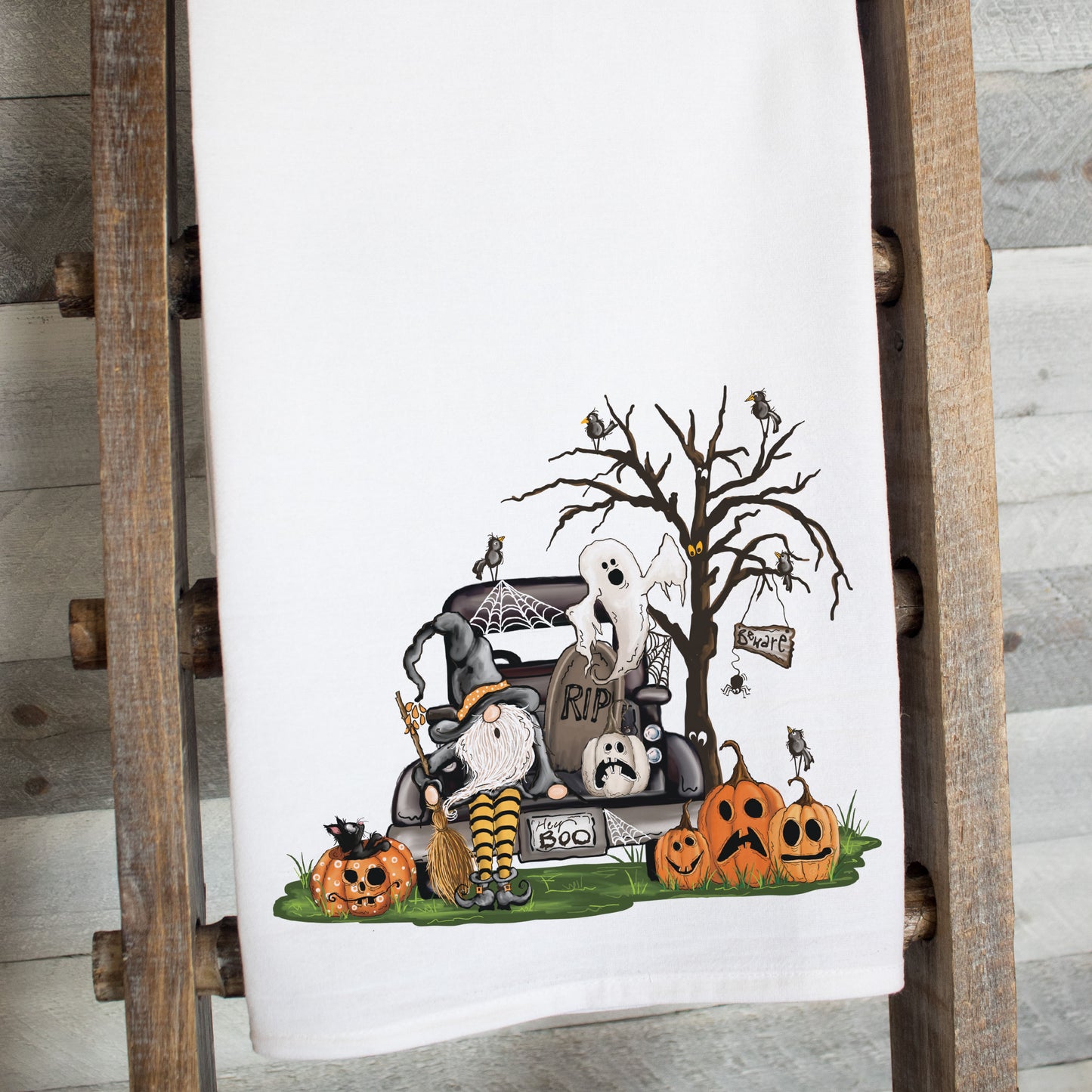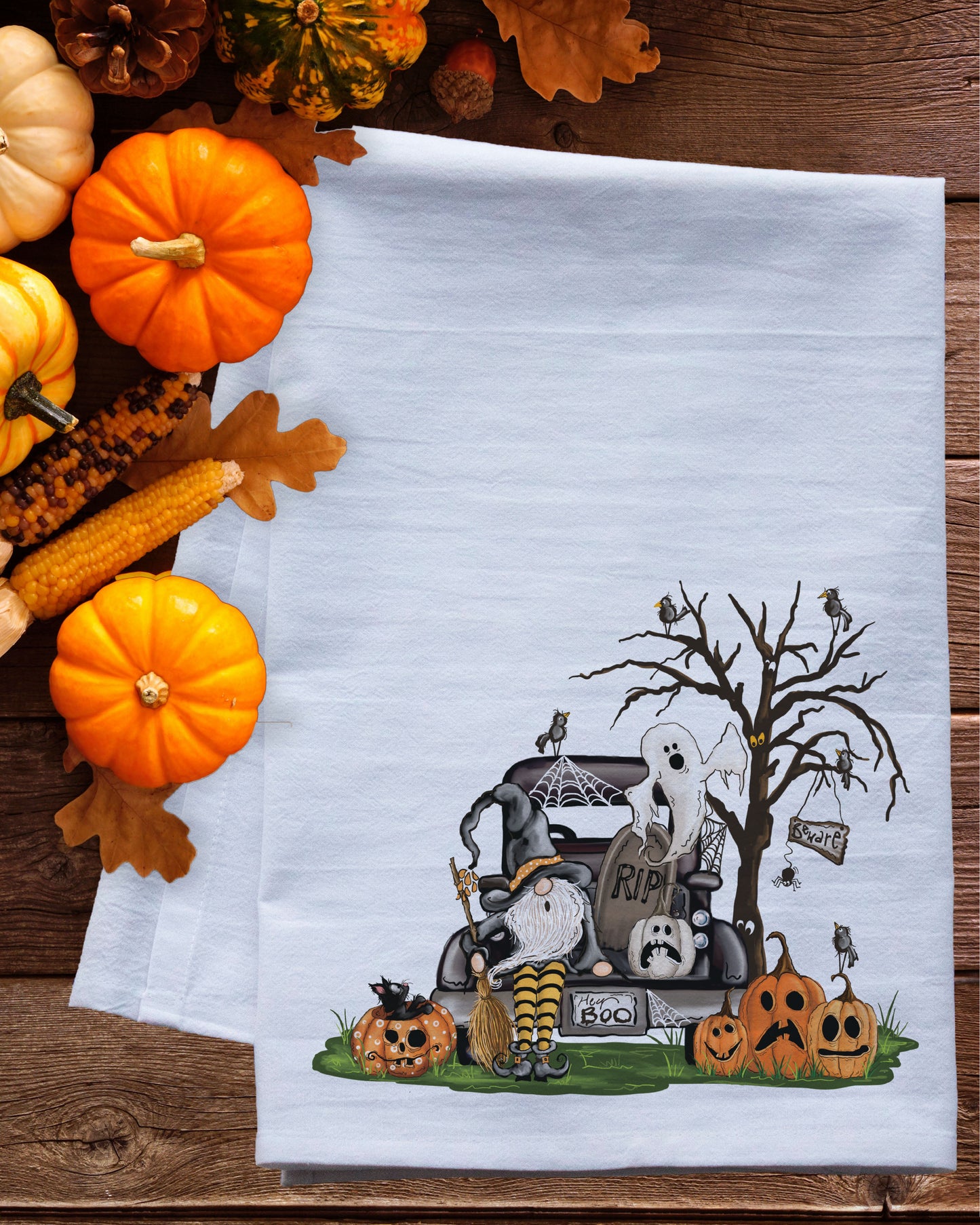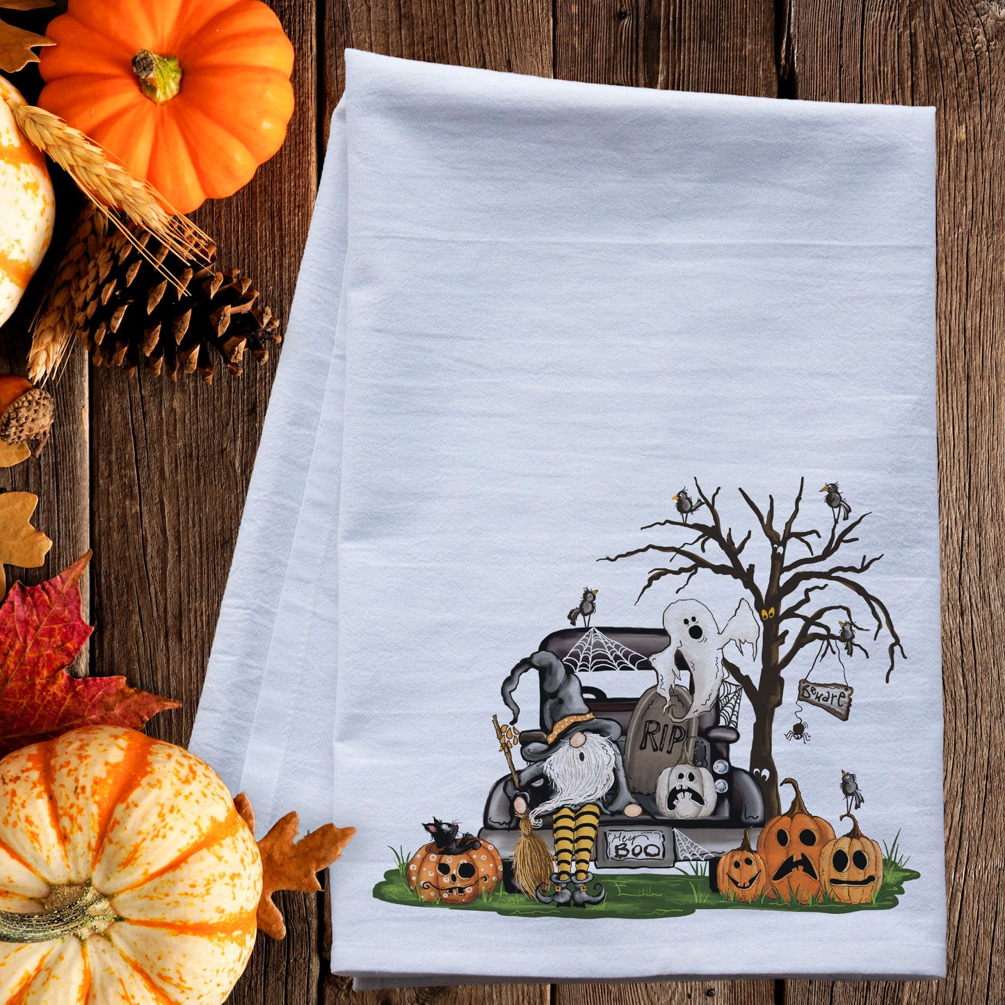 Add a dash of Halloween fun to your kitchen with our "Hey Boo" Fall Pumpkins Tea Towel! This adorable cotton towel showcases a cute scene filled with pumpkins, a spooky gnome, and playful ghosts. It’s crafted from soft, durable cotton to ensure it holds up through all your fall festivities.