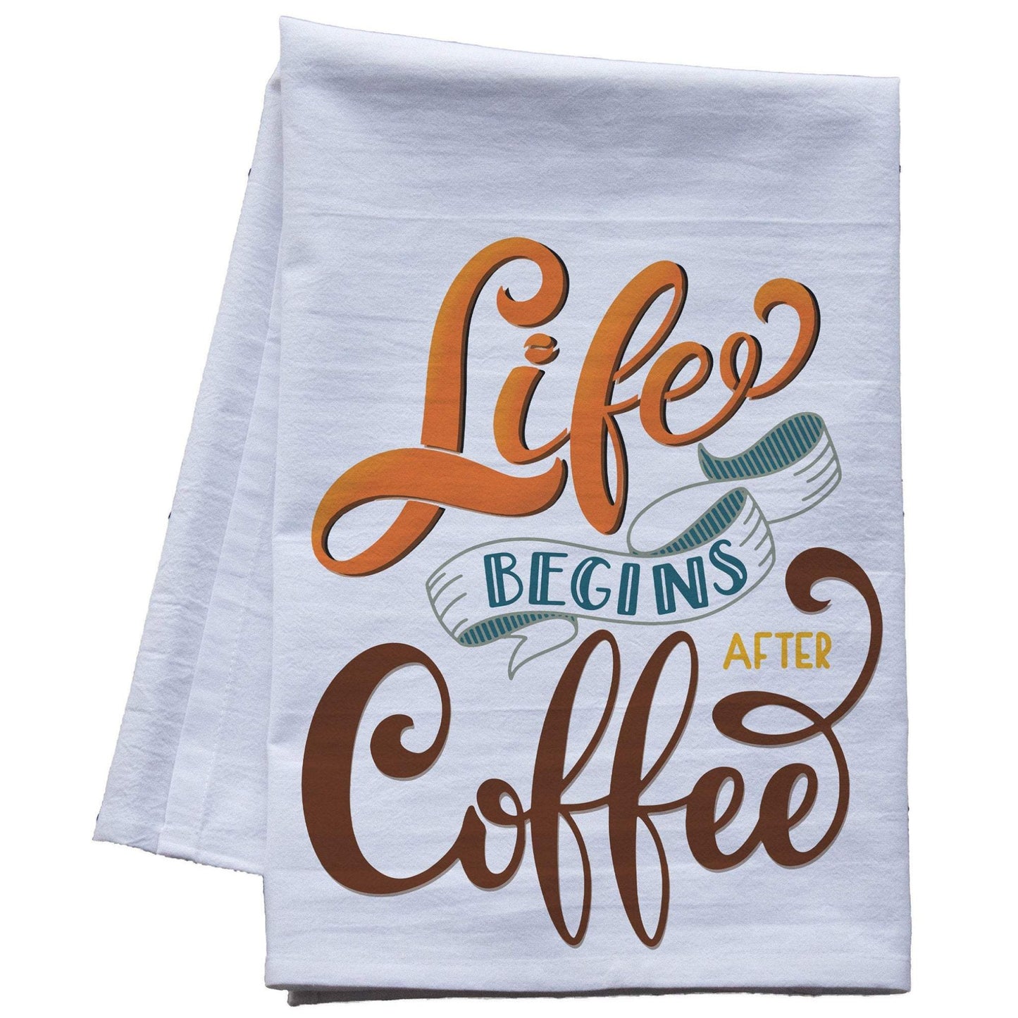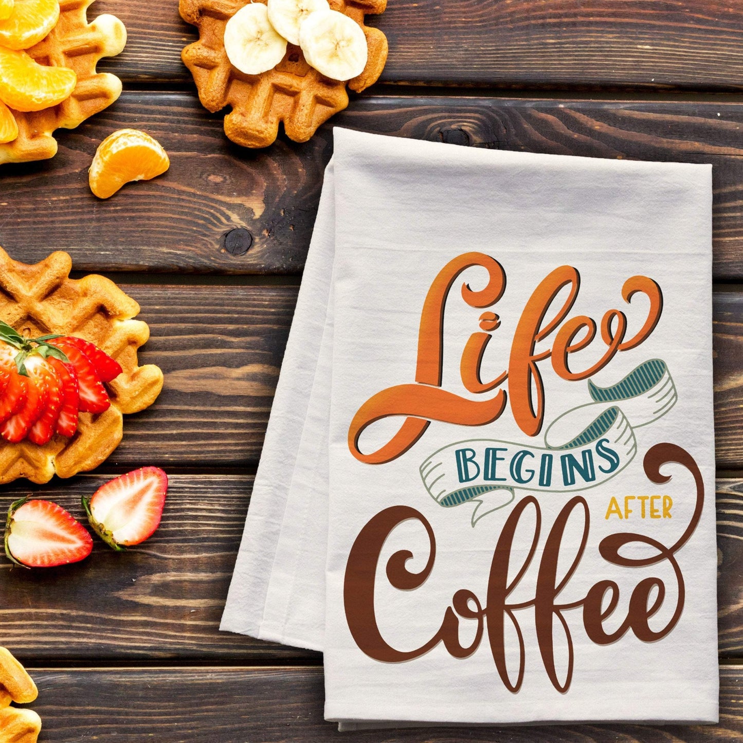 Life only begins after that first cup of coffee in the morning! Spruce up the coffee bar with this fun, colorful tea towel.