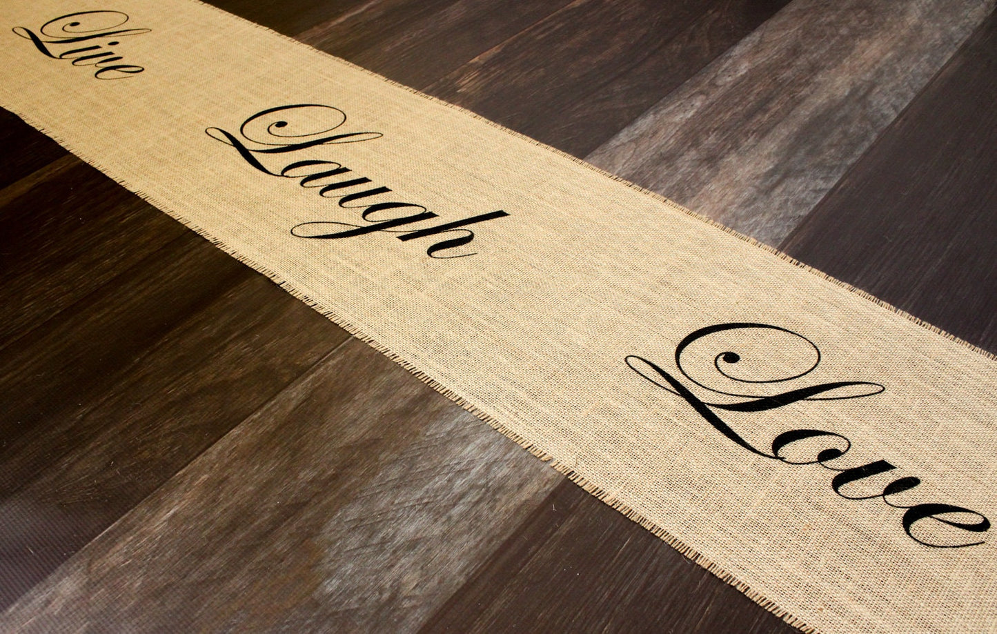 This listing is for a table runner with Live Laugh Love in large script, evenly spaced down the middle. The runner measures 12" x 64". It's personally designed by me and printed directly onto the burlap; no paint, no vinyl, no stickers, just burlap. I am a stickler for quality and go to great lengths to source premium jute burlap. I get my burlap directly from a mill on the East coast for its tight weave and smooth texture. I intend for my creations to grace tables for years to come! The edges are frayed then sewn to prevent further unraveling. Hand wash please.