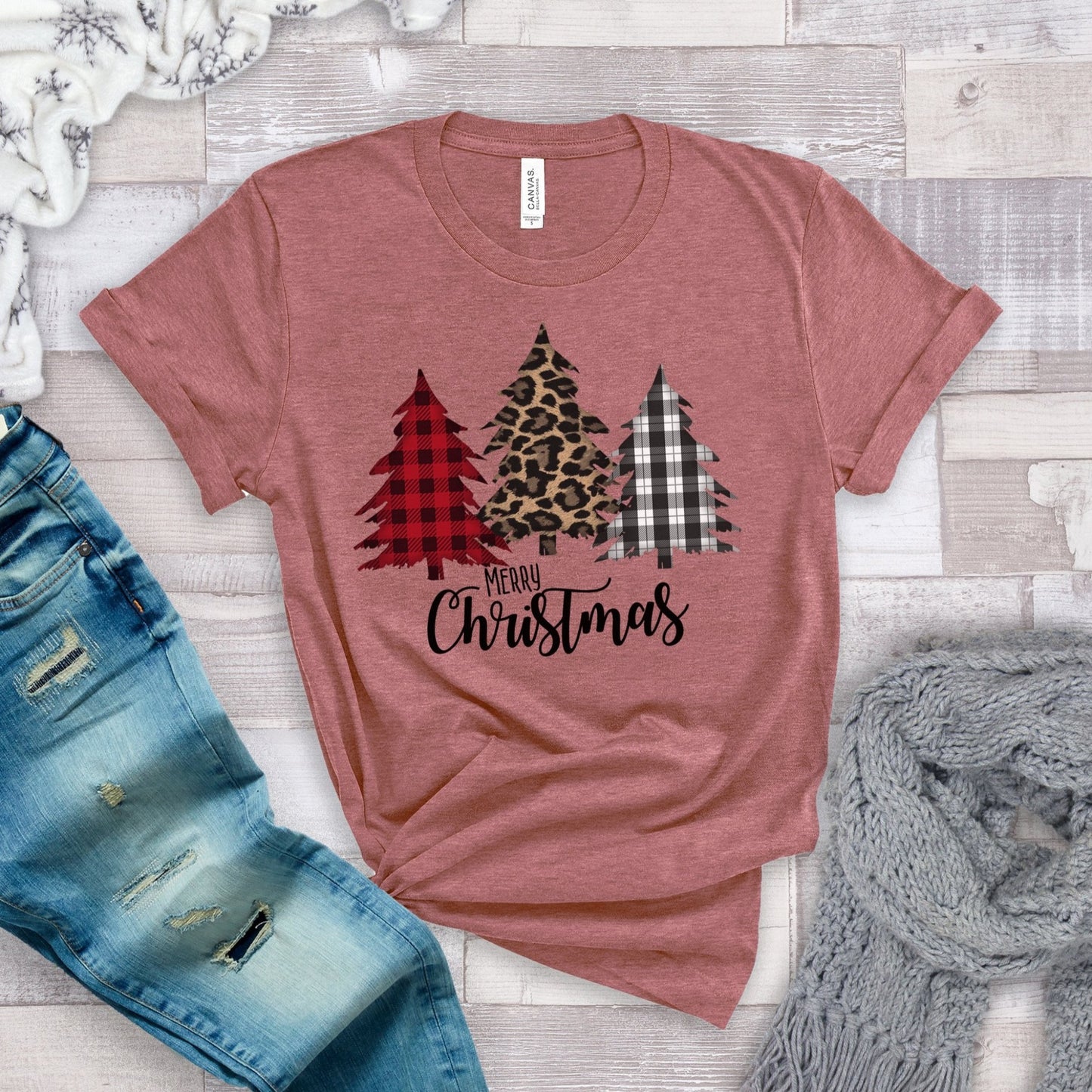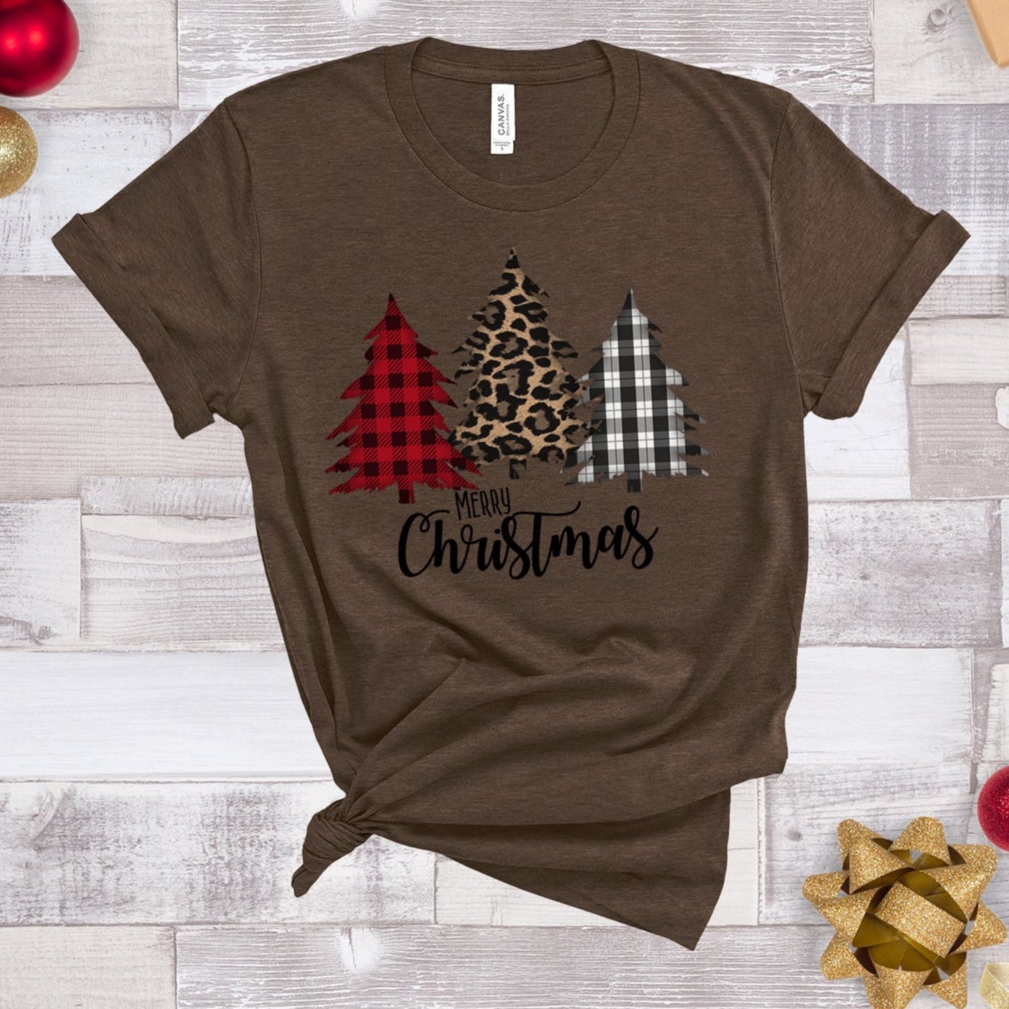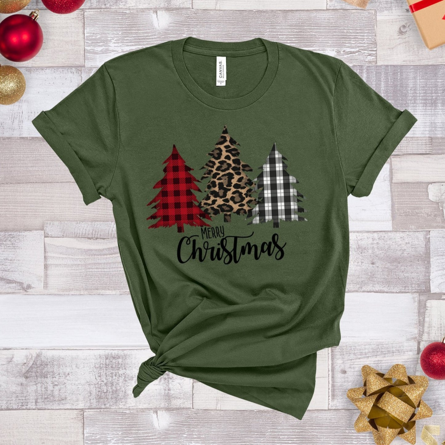 Merry Christmas t-shirt - with buffalo check plaid and leopard print Christmas trees