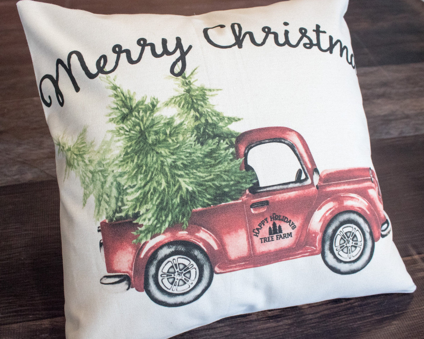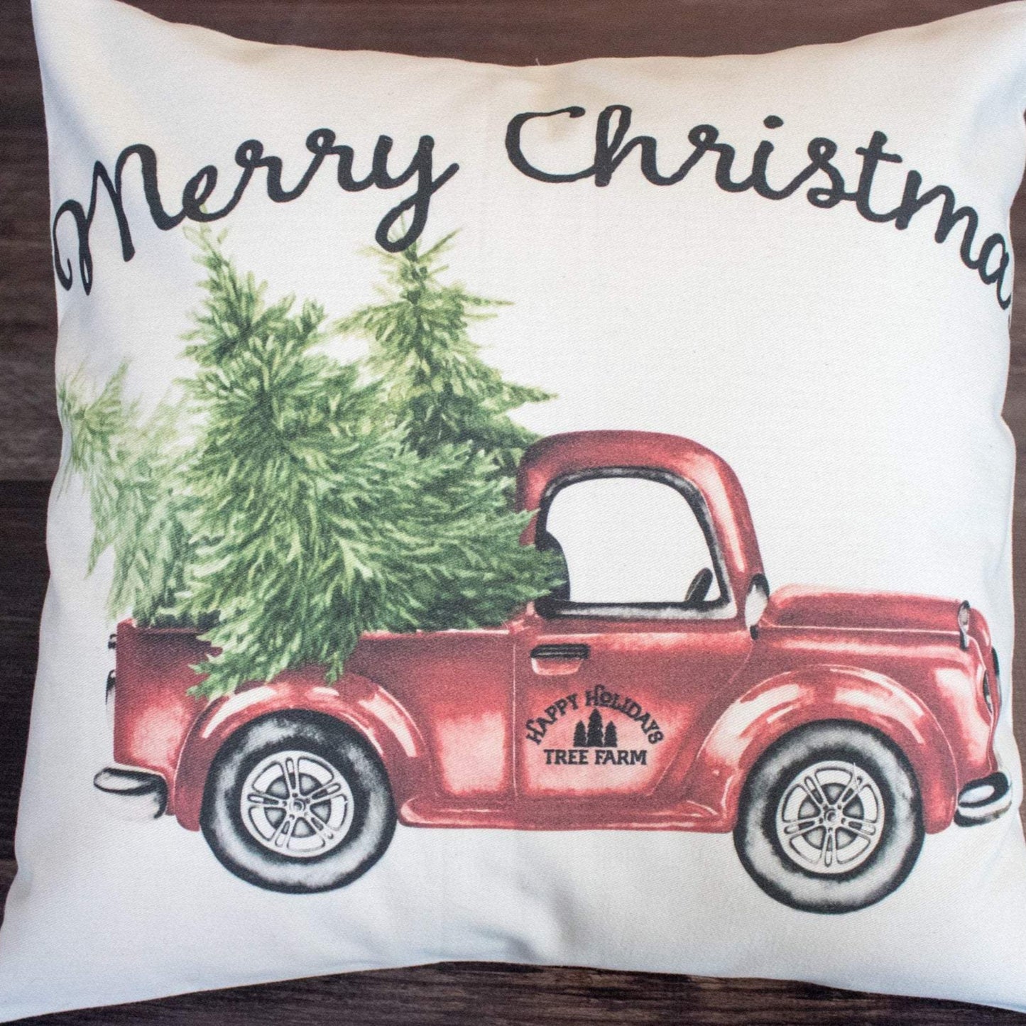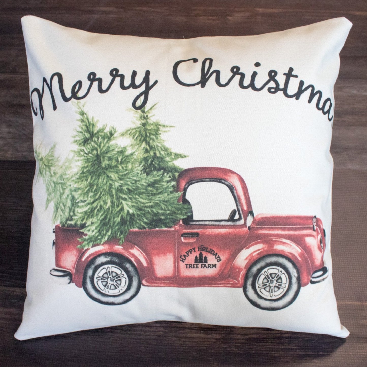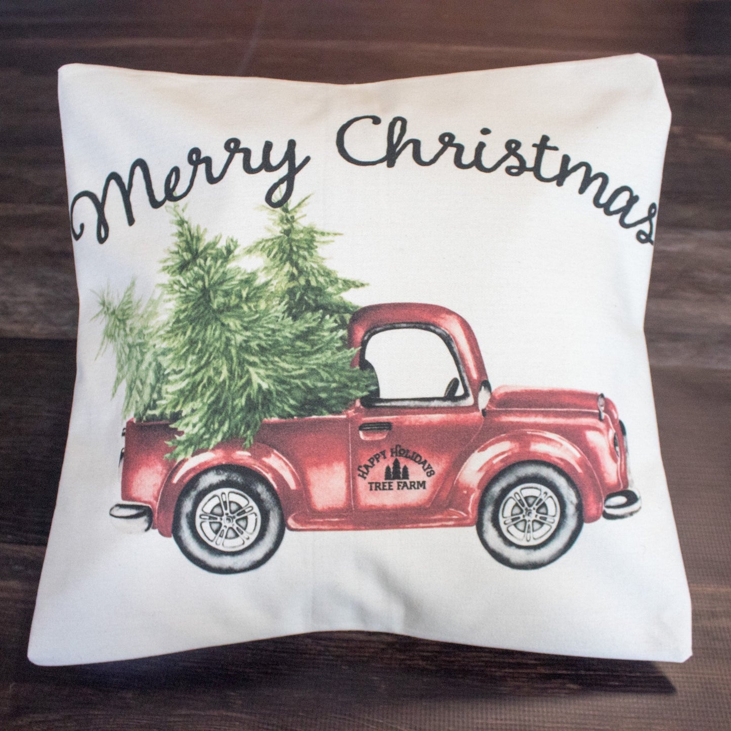 This vintage red truck with it's bed full of Christmas trees from the Happy Holidays Christmas Tree Farm is here to wish you and your guests a Merry Christmas! It is printed on SUPER soft brushed, off white twill and is delightfully squeezable. Whether you are decorating your own home or gifting this charming throw pillow for a Christmas or hostess gift, it's sure to fit perfectly into almost any decor.