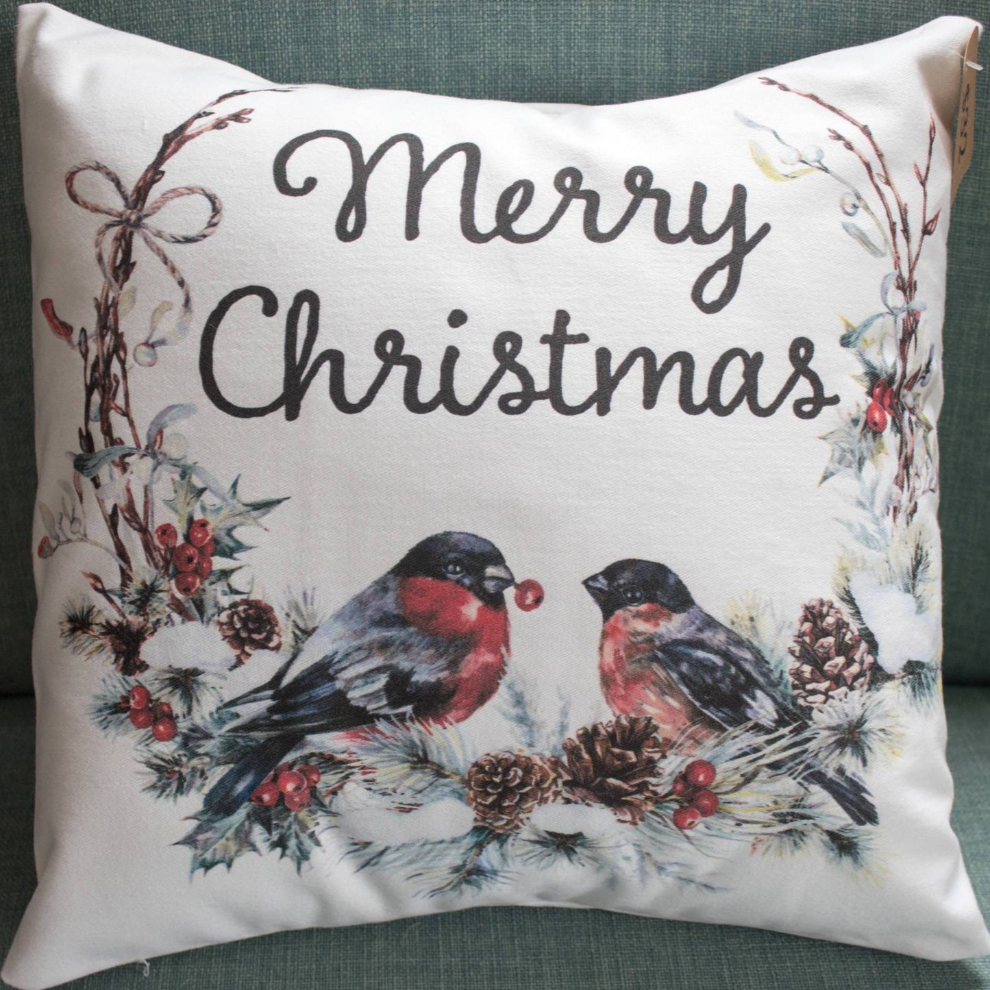 Merry Christmas Wreath throw pillow - Holiday bullfinch bird and feather rustic farmhouse style gift