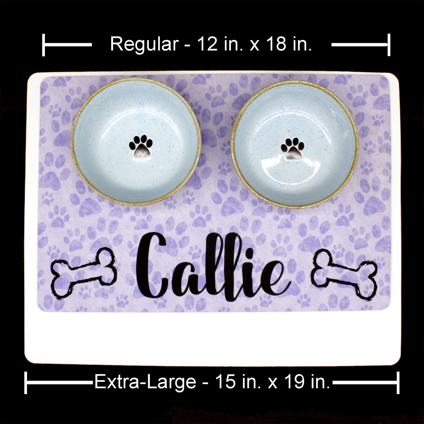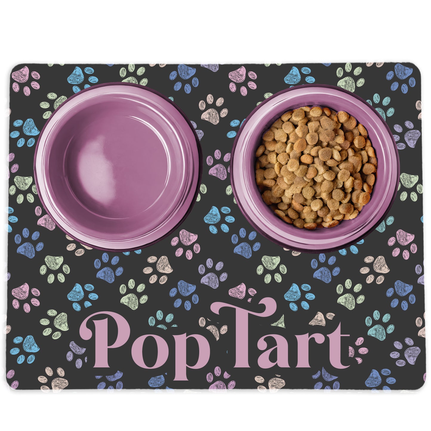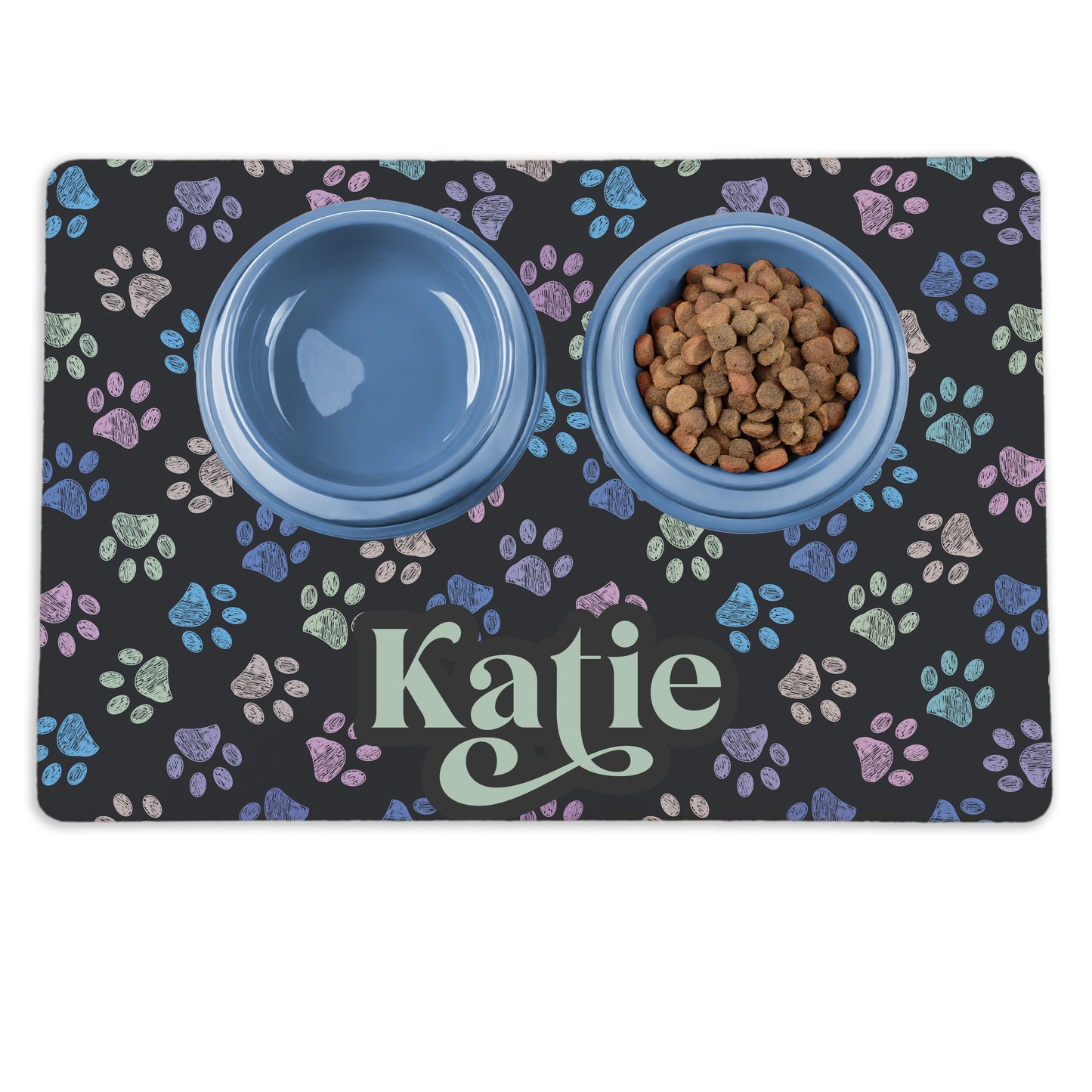 Fabric top features your pet's name along the bottom and pastel pawprints cover the dark background. It's both cute AND will absorb those drips and spills from your pup!