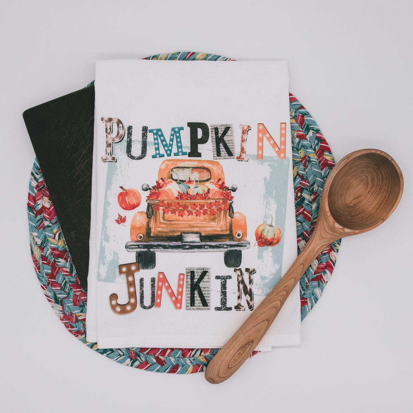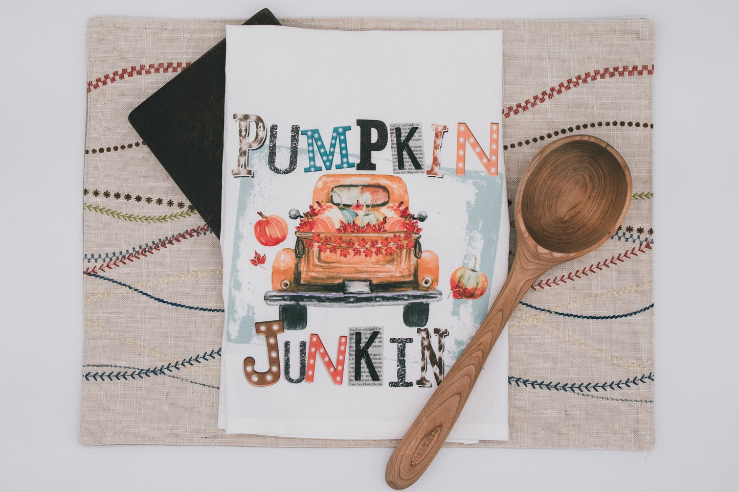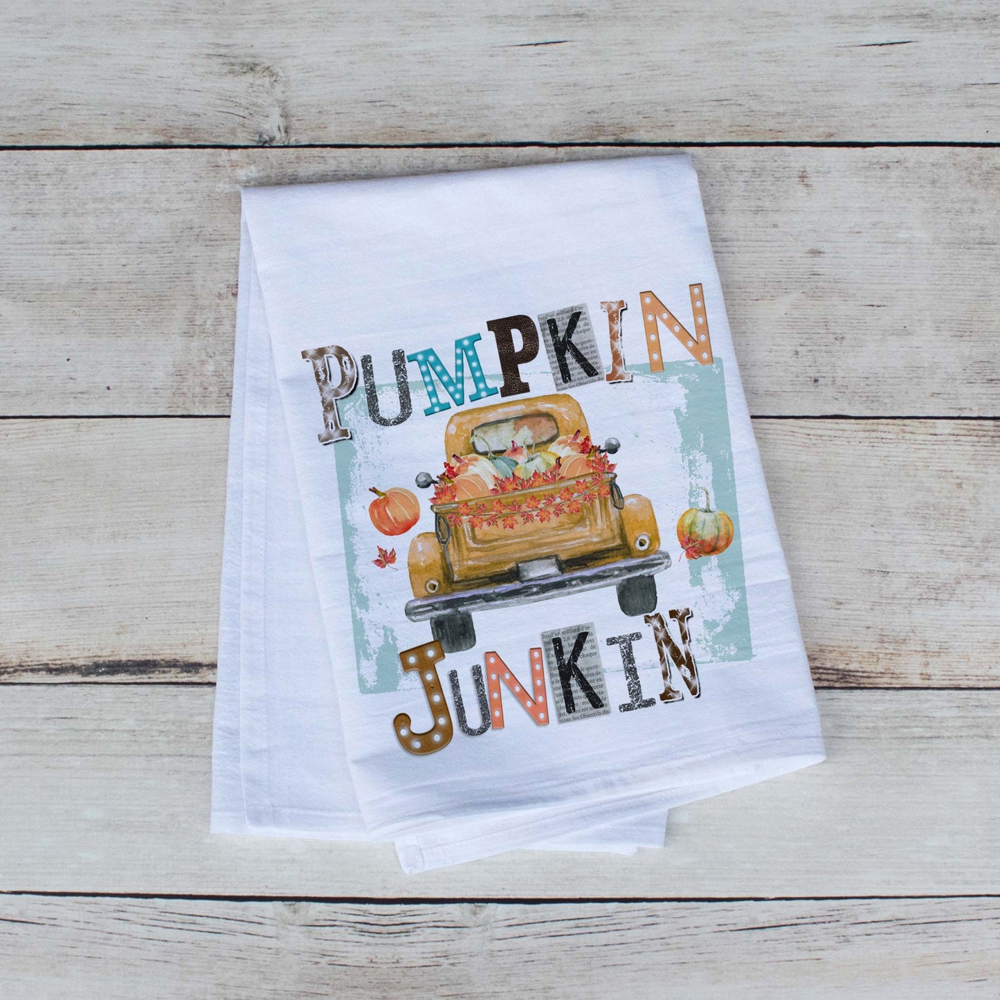 Pumpkin Junkin Autumn Tea Towel - premium flour sack dish towel old truck of pumpkins fall decor