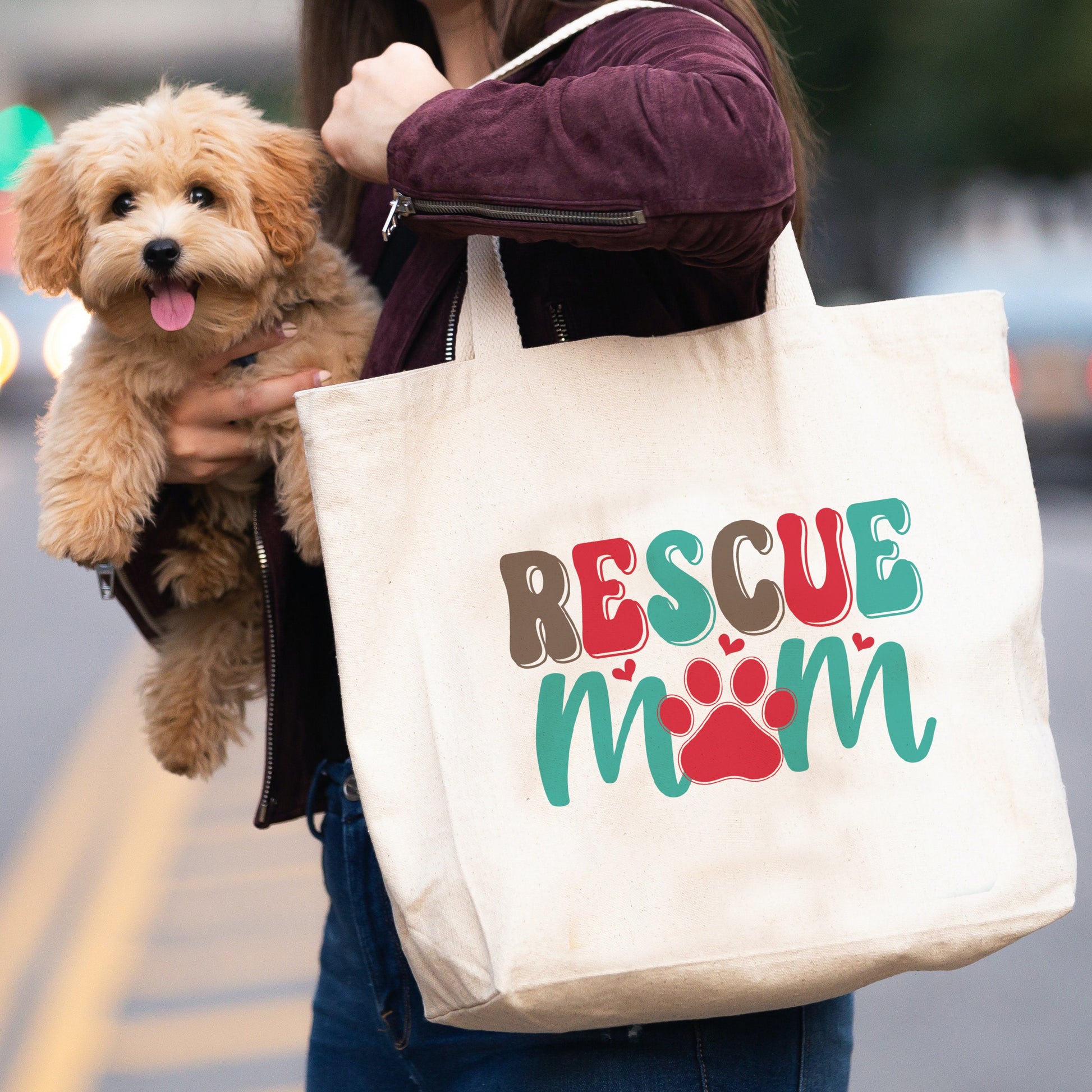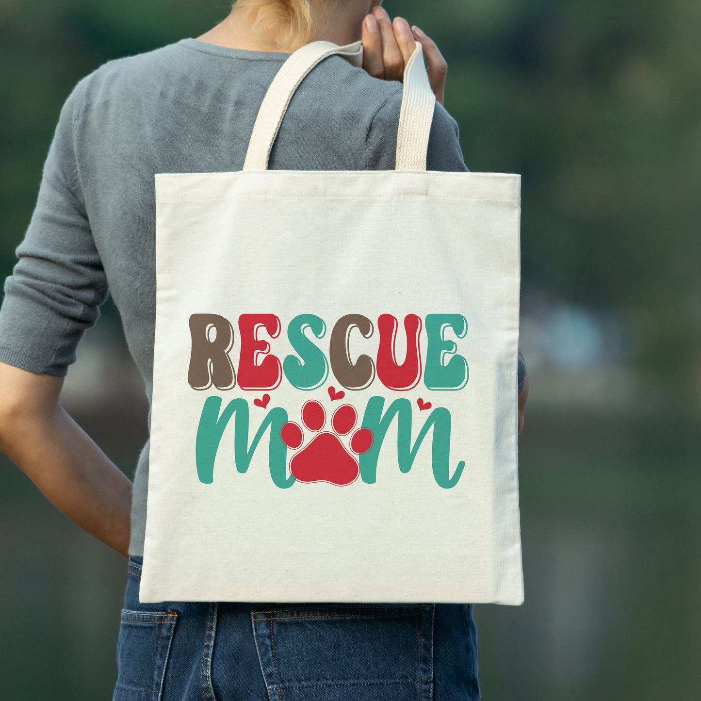 Designed and printed locally in Wyoming. Embrace sustainable fashion with our Rescue Mom Canvas Tote Bag – a durable and useful bag that reflects your love for animals.