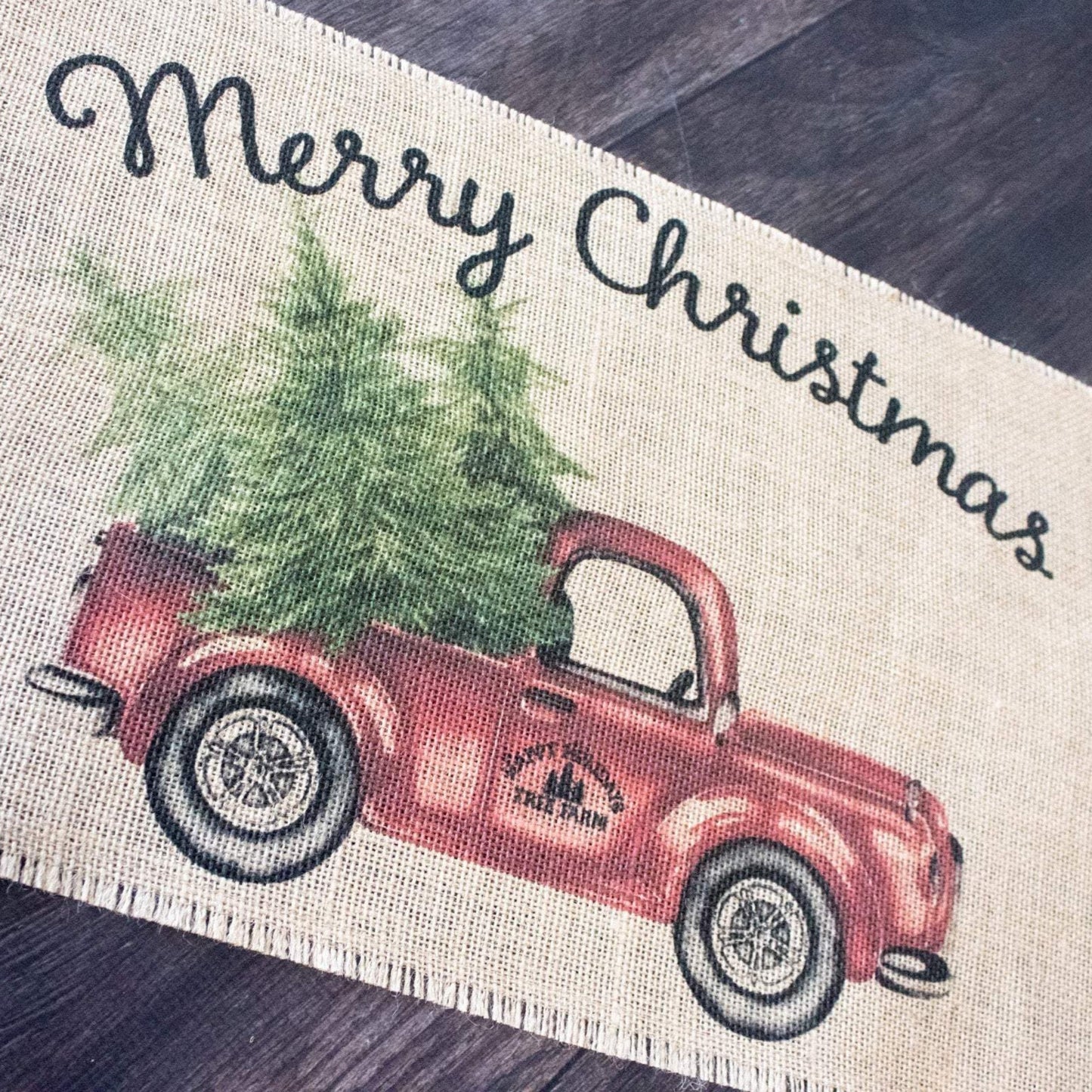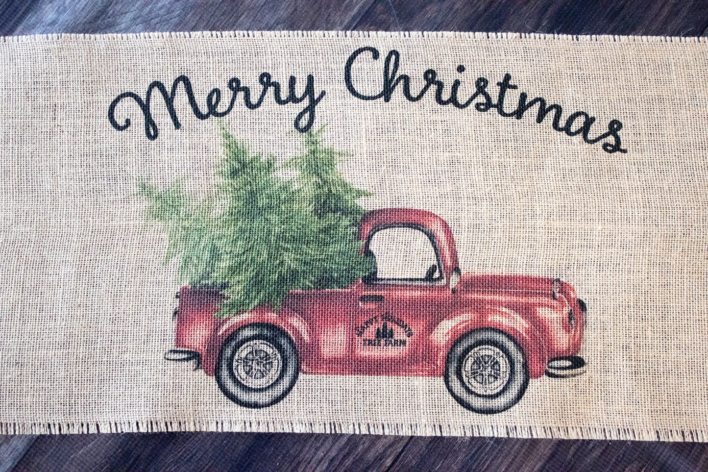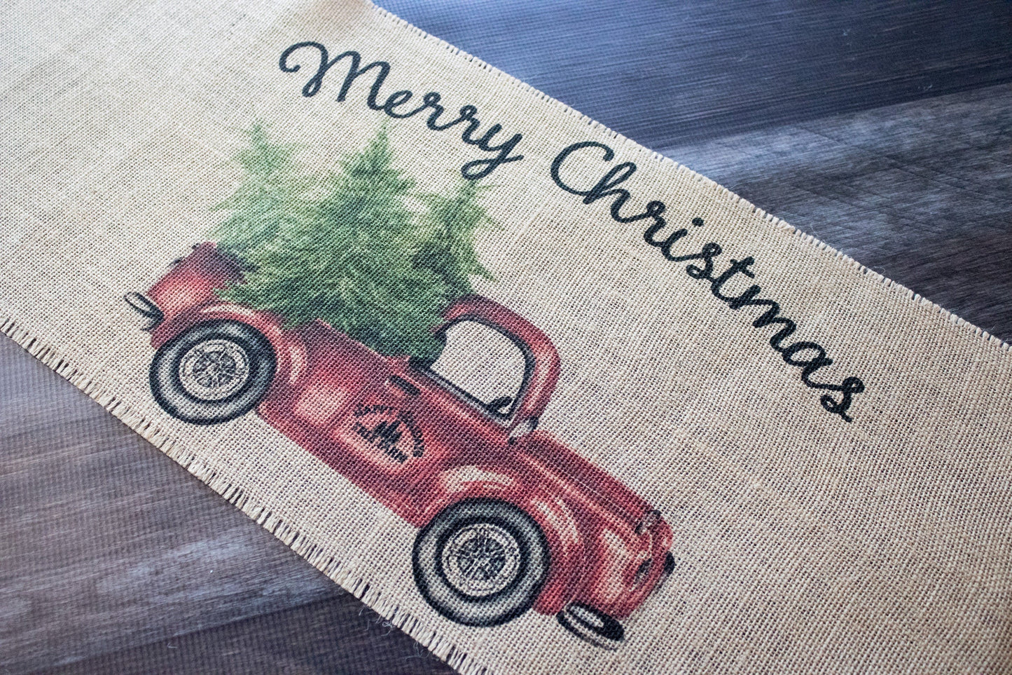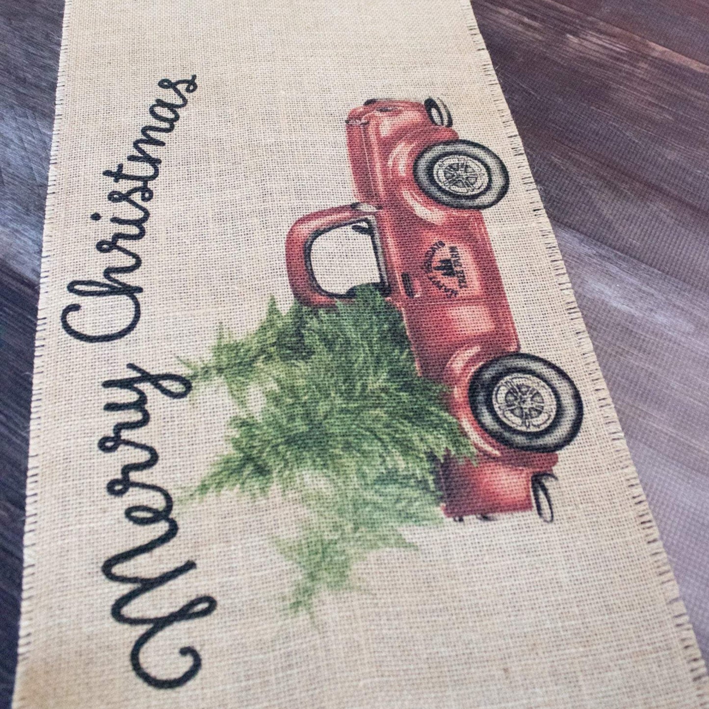 This vintage red truck with it's bed full of Christmas trees from the Happy Holidays Christmas Tree Farm is here to wish you and your guest a Merry Christmas! Whether you are hosting a holiday dinner or gifting this charming burlap table runner for a Christmas or hostess gift, this charming table runner will fit perfectly in rustic style farmhouse decor.