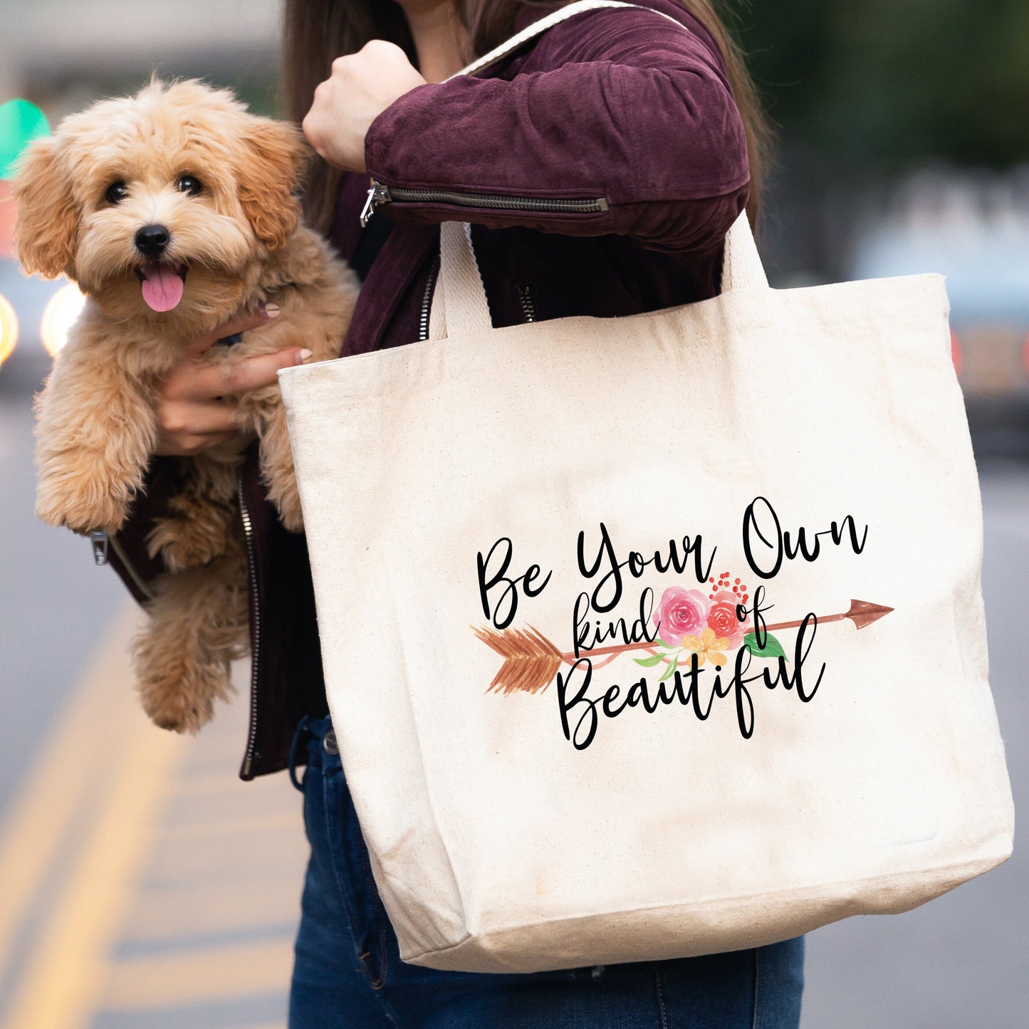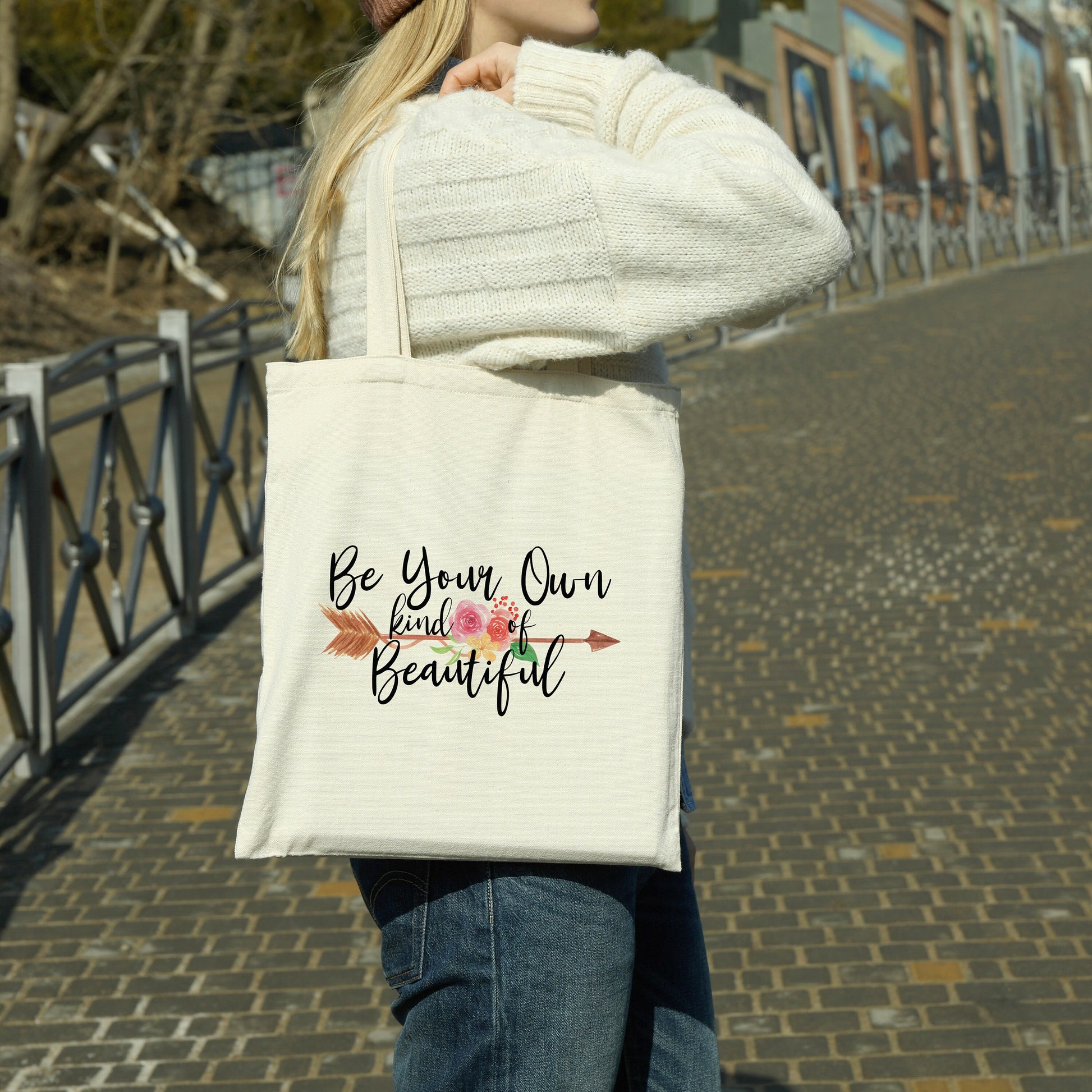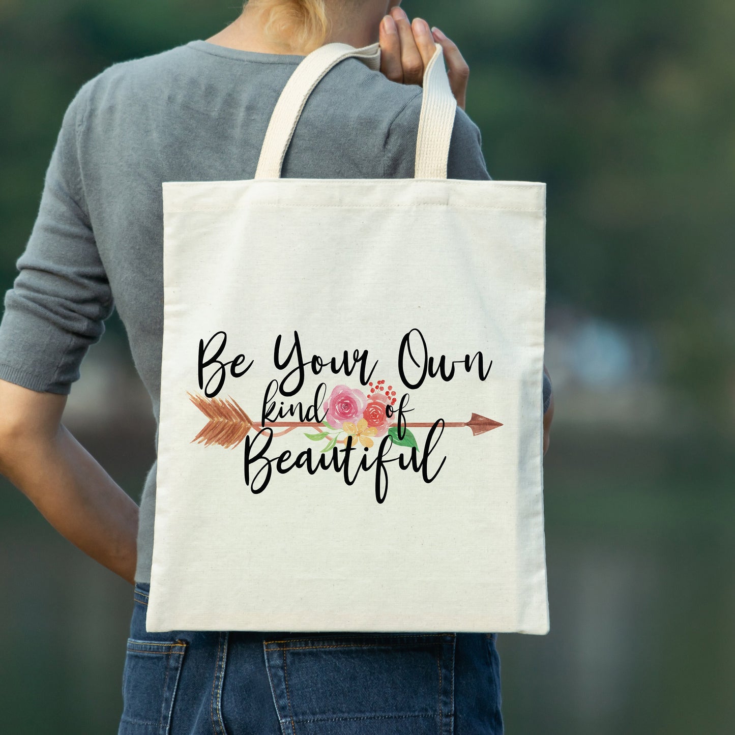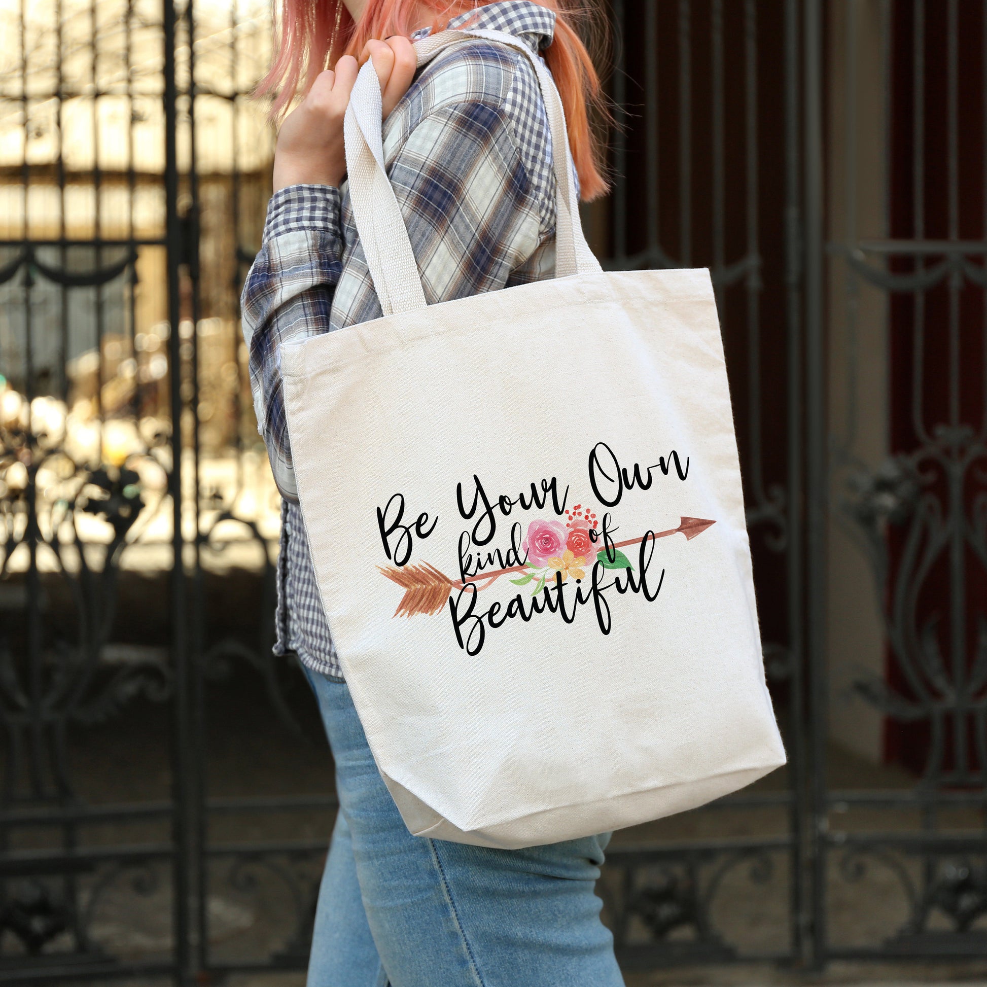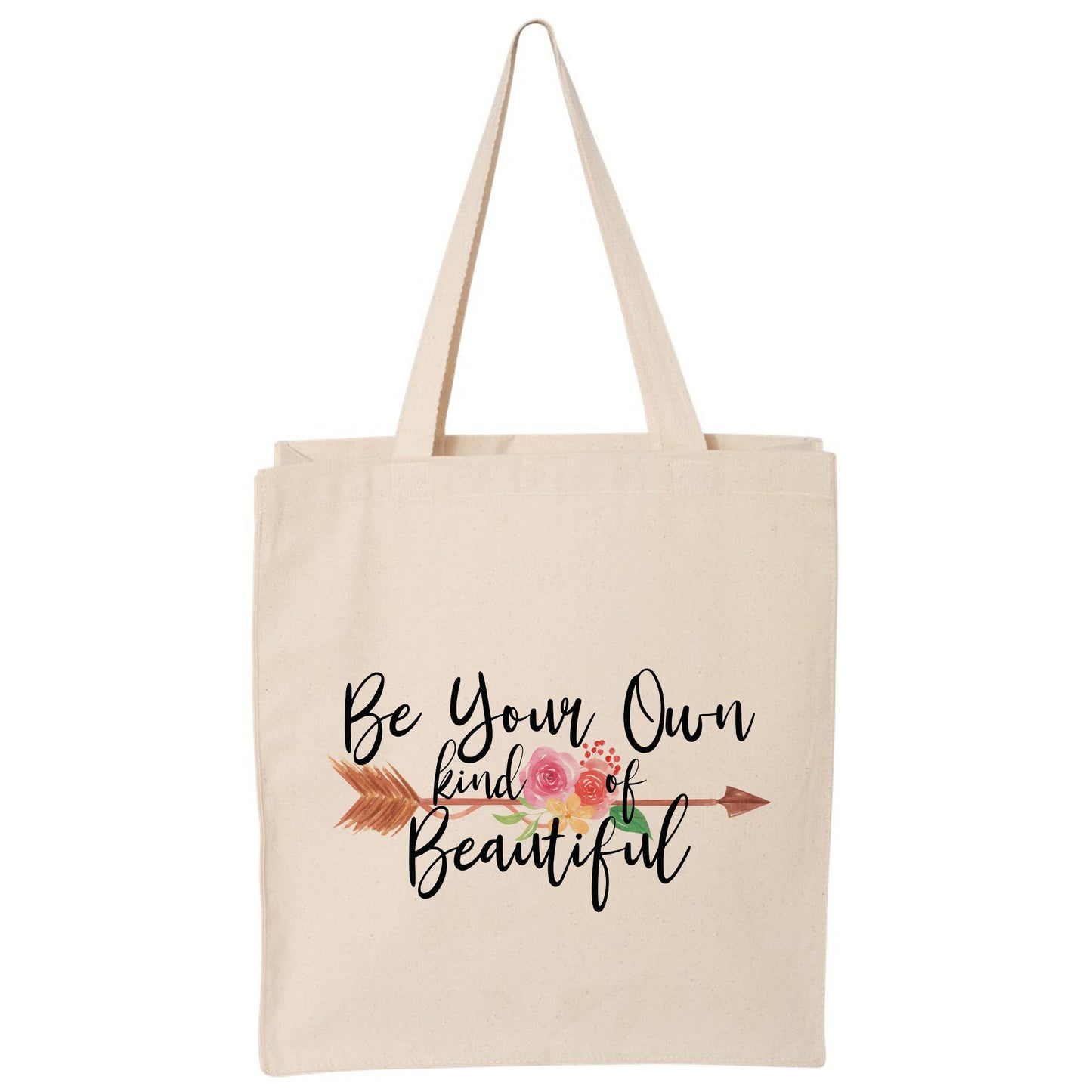 Add some inspiration to your everyday errand runs with this charming Be Your Own Kind of Beautiful Canvas Tote Bag. Made from premium textured canvas, this tote features a beautiful arrow and flowers. It's perfect for anyone with a boho style and loves farmers markets. With its gusseted bottom, this tote offers plenty of space for your daily essentials, whether it's books, a planner, or a laptop. It's also great for trips to the farmers market as it can easily hold produce. But the best part? This tote is reusable and eco-friendly, providing a sustainable option for all your shopping needs.
